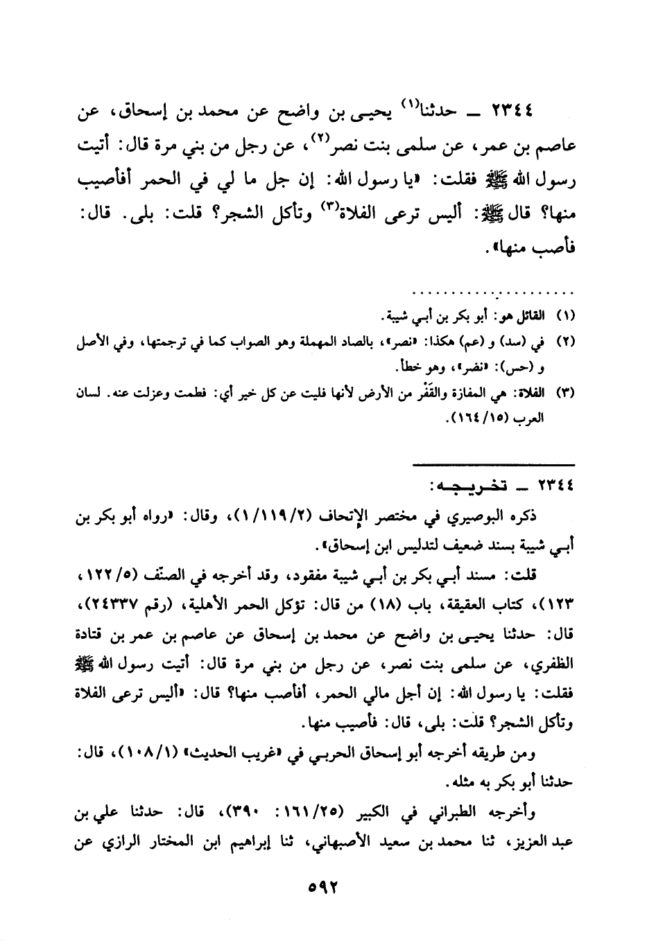 2344 - حَدَّثَنَا يَحْيَى بْنُ وَاضِحٍ عَنْ مُحَمَّدِ بْنِ إِسْحَاقَ عَنْ عَاصِمِ بْنِ عُمَرَ عَنْ سَلْمَى بِنْتِ نَصْرٍ عَنْ رَجُلٍ مِنْ بَنِي مُرَّةَ قَالَ أَتَيْتُ رَسُولَ اللَّهِ صَلَّى اللَّهُ عَلَيْهِ وَسَلَّمَ فَقُلْتُ يَا رَسُولَ اللَّهِ إِنَّ جُلَّ مَا لِي فِي الْحُمُرِ أَفَأُصِيبُ مِنْهَا قَالَ صَلَّى اللَّهُ عَلَيْهِ وَسَلَّمَ §أَلَيْسَ تَرْعَى الْفَلَاةَ وَتَأْكُلُ الشَّجَرَ قُلْتُ بَلَى قَالَ فَأَصِبْ مِنْهَا