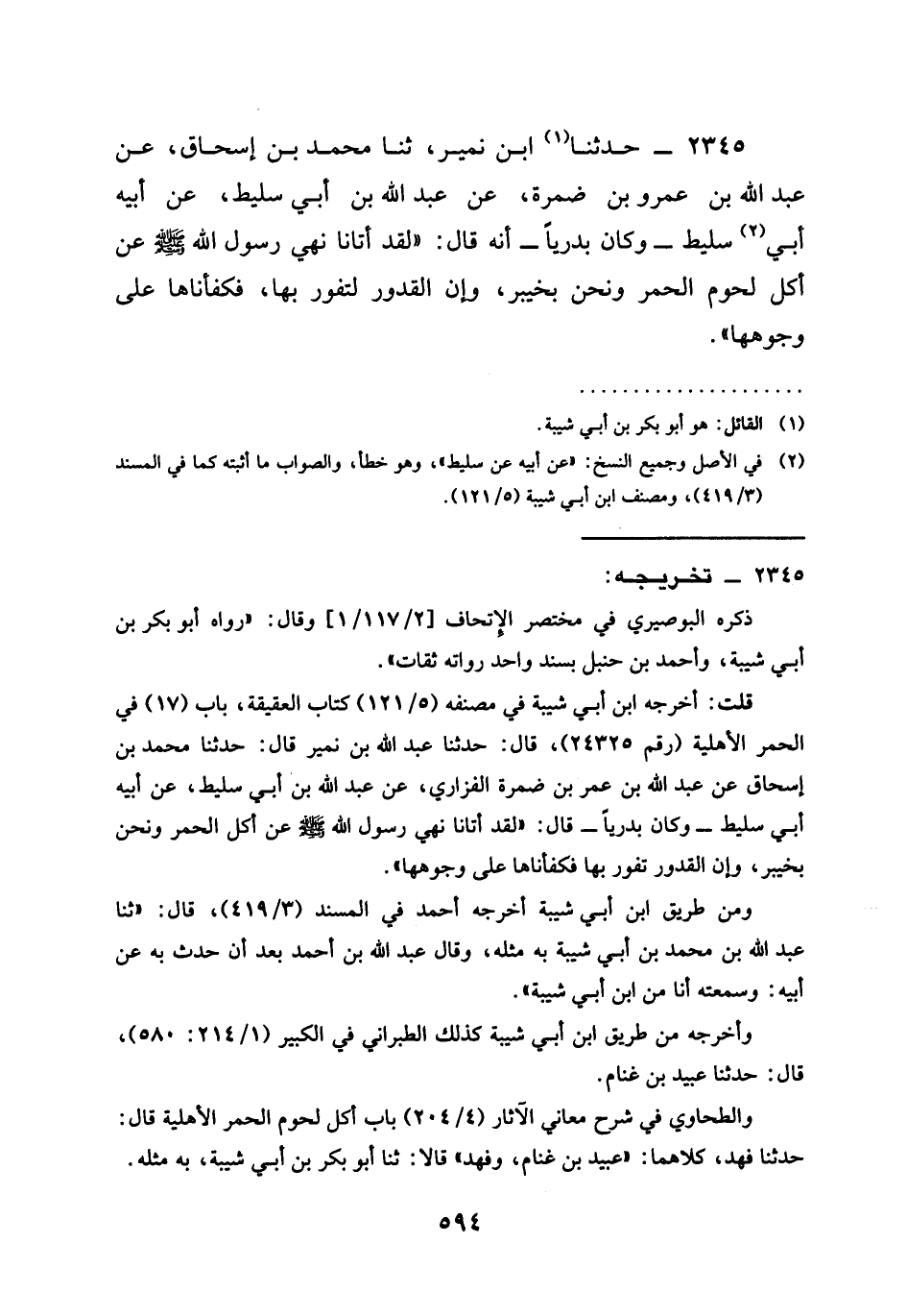 2345 - حَدَّثَنَا ابْنُ نُمَيْرٍ ثنا مُحَمَّدُ بْنُ إِسْحَاقَ عَنْ عَبْدِ اللَّهِ بْنِ عَمْرِو بْنِ ضَمْرَةَ عَنْ عَبْدِ اللَّهِ بْنِ أَبِي سَلِيطٍ عَنْ أَبِيهِ أَبِي سَلِيطٍ وَكَانَ بَدْرِيًّا أَنَّهُ قَالَ §لَقَدْ أَتَانَا نَهْيُ رَسُولِ اللَّهِ صَلَّى اللَّهُ عَلَيْهِ وَسَلَّمَ عَنْ أَكْلِ لُحُومِ الْحُمُرِ وَنَحْنُ بخير وَإِنَّ الْقُدُورَ لَتَفُورُ بِهَا فَكَفَأْنَاهَا عَلَى وُجُوهِهَا