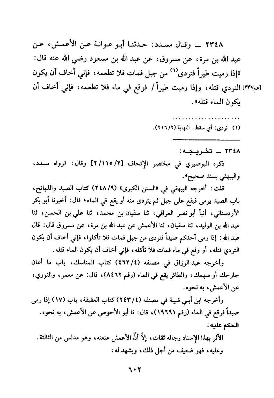 2348 - وَقَالَ مُسَدَّدٌ حَدَّثَنَا أَبُو عَوَانَةَ عَنِ الْأَعْمَشِ عَنْ عَبْدِ اللَّهِ بْنِ مُرَّةَ عَنْ مَسْرُوقٍ عَنْ عَبْدِ اللَّهِ بْنِ مَسْعُودٍ رَضِيَ الله عَنْهُ قَالَ §إِذَا رَمَيْتَ طَيْرًا فَتَرَدَّى مِنْ جَبَلٍ فَمَاتَ فَلَا تَطْعَمْهُ فَإِنِّي أَخَافُ أَنْ يَكُونَ التَّرَدِّي قَتَلَهُ وَإِذَا رَمَيْتَ طَيْرًا فَوَقَعَ فِي مَاءٍ فَلَا تَطْعَمْهُ فَإِنِّي أَخَافُ أَنْ يَكُونَ الْمَاءُ قَتَلَهُ