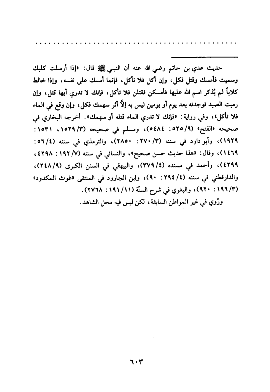 = حديث عدي بن حاتم رَضِيَ اللَّهُ عَنْهُ أَنَّ النَّبِيَّ -صَلَّى اللَّهُ عليه وسلم- قال: "إذا أرسلت كلبك وسميت فأمسك وقتل فكل، وإن أكل فلا تأكل، فإنما أمسك على نفسه، وإذا خالط كلابًا لم يُذكر اسم الله عليها فأمسكن فقتلن فلا تأكل، فإنك لا تدري أيها قتل، وإن رميت الصيد فوجدته بعد يوم أو يومين ليس به إلَّا أثر سهمك فكل، وإن وقع في الماء فلا تأكل"، وفي رواية: "فإنك لا تدري الماء قتله أوسهمك". أخرجه البخاري في صحيحه "الفتح" (9/ 525: 5484)، ومسلم في صحيحه (3/ 1529، 1531: 1929)، وأبو داود في سننه (3/ 270: 2850)، والترمذي في سننه (4/ 56: 1469)، وقال: "هذا حديث حسن صحيح"، والنسائي في سننه (7/ 192: 4298، 4299)، وأحمد في مسنده (4/ 379)، والبيهقي في السنن الكبرى (9/ 248)، والدارقطني في سننه (4/ 294: 90)، وابن الجارود في المنتقى "غوث المكدود" (3/ 196: 920)، والبغوي في شرح السنة (11/ 191: 2768).