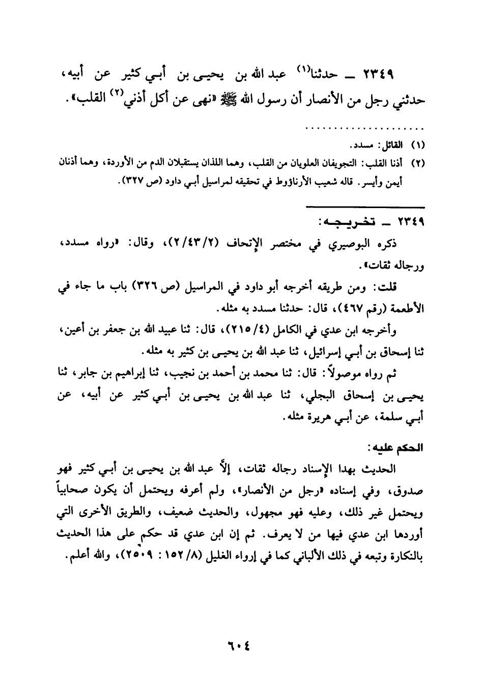 2349 - حَدَّثَنَا عَبْدُ اللَّهِ بْنُ يَحْيَى بْنِ أَبِي كَثِيرٍ عَنْ أَبِيهِ حَدَّثَنِي رَجُلٌ مِنَ الْأَنْصَارِ أَنَّ رَسُولَ اللَّهِ صَلَّى اللَّهُ عَلَيْهِ وَسَلَّمَ §نَهَى عَنْ أَكْلِ أُذُنَيِ الْقَلْبِ
