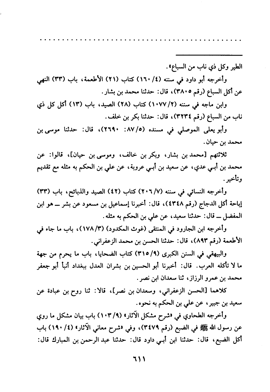 وأخرجه أبو داود في سننه (4/ 160) كتاب (21) الأطعمة، باب (33) النهي عن أكل السباع (رقم 3805)، قال: حدّثنا محمَّد بن بشار.