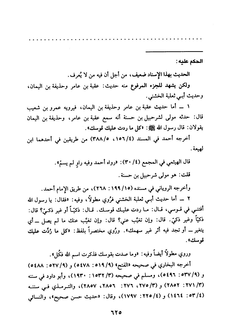 1 - أما حديث عقبة بن عامر وحذيفة بن اليمان، فيرويه عمرو بن شعيب قال: حدثه مولى لشرحبيل بن حسنة أنه سمع عقبة بن عامر، وحذيفة بن اليمان يقولان: قَالَ رَسُولُ اللَّهِ -صَلَّى اللَّهُ عَلَيْهِ وَسَلَّمَ-: "كل ما ردت عليك قوسك".