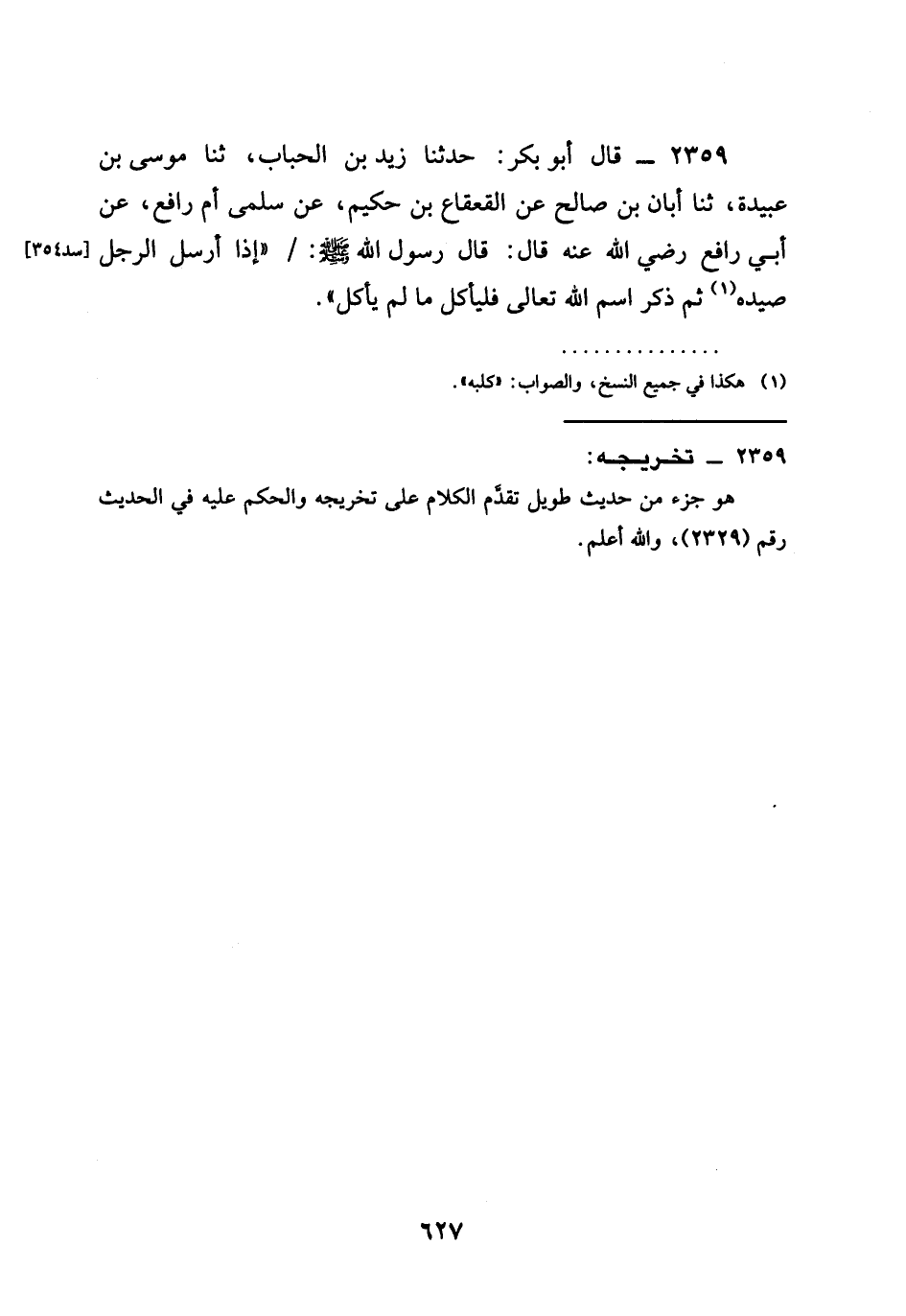 2359 - قال أَبُو بَكْرٍ حَدَّثَنَا زَيْدُ بْنُ الْحُبَابِ ثنا مُوسَى بْنُ عُبَيْدَةَ ثنا أَبَانُ بْنُ صَالِحٍ عَنِ الْقَعْقَاعِ بْنِ حَكِيمٍ عَنْ سَلْمَى أُمِّ رَافِعٍ عَنْ أَبِي رَافِعٍ رَضِيَ الله عَنْهُ قَالَ قَالَ رَسُولُ اللَّهِ صَلَّى اللَّهُ عَلَيْهِ وَسَلَّمَ §إِذَا أَرْسَلَ الرَّجُلُ صَيْدَهُ ثُمَّ ذَكَرَ اسْمَ اللَّهِ تَعَالَى فَلْيَأْكُلْ مَا لَمْ يَأْكُلْ