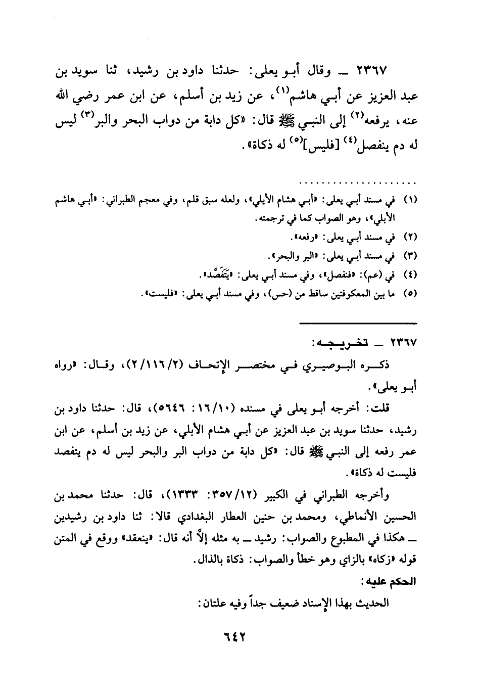 2367 - وَقَالَ أَبُو يَعْلَى حَدَّثَنَا دَاوُدُ بْنُ رُشَيْدٍ ثنا سُوَيْدُ بْنُ عَبْدِ الْعَزِيزِ عَنْ أَبِي هَاشِمٍ عَنْ زَيْدِ بْنِ أَسْلَمَ عَنِ ابْنِ عُمَرَ رَضِيَ الله عَنْهُ يَرْفَعُهُ إِلَى النَّبِيِّ صَلَّى اللَّهُ عَلَيْهِ وَسَلَّمَ قَالَ §كُلُّ دَابَّةٍ مِنْ دَوَابِّ الْبَحْرِ وَالْبَرِّ لَيْسَ لَهُ دَمٌ يَنْفَصِلُ فَلَيْسَ لَهُ ذَكَاةٌ
