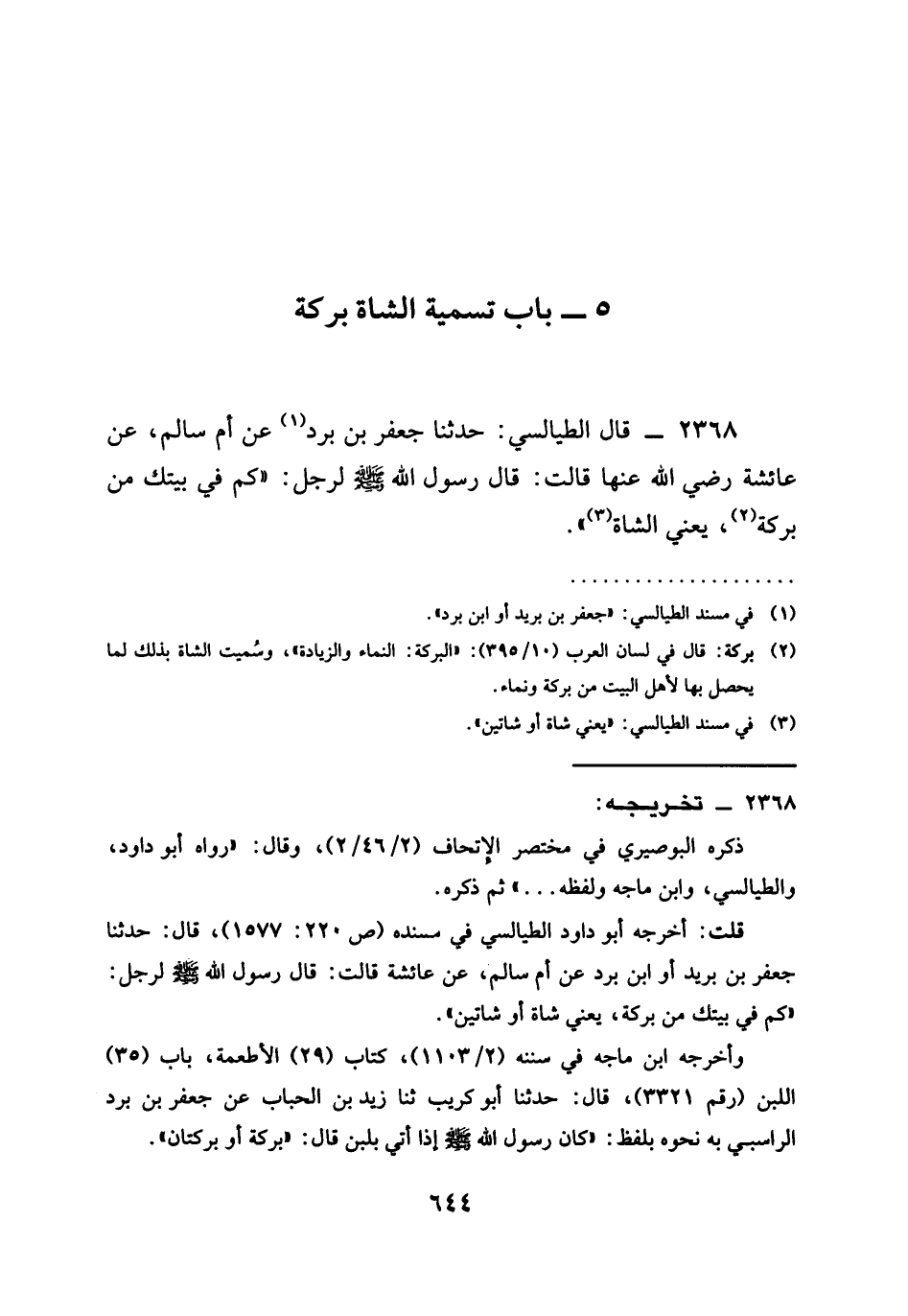 2368 - قَالَ الطَّيَالِسِيُّ حَدَّثَنَا جَعْفَرُ بْنُ بُرْدٍ عَنْ أُمِّ سَالِمٍ عَنْ عَائِشَةَ رَضِيَ الله عَنْهَا قَالَتْ قَالَ رَسُولُ اللَّهِ صَلَّى اللَّهُ عَلَيْهِ وَسَلَّمَ لِرَجُلٍ §كَمْ فِي بَيْتِكَ مِنْ بَرَكَةٍ يَعْنِي الشَّاةَ