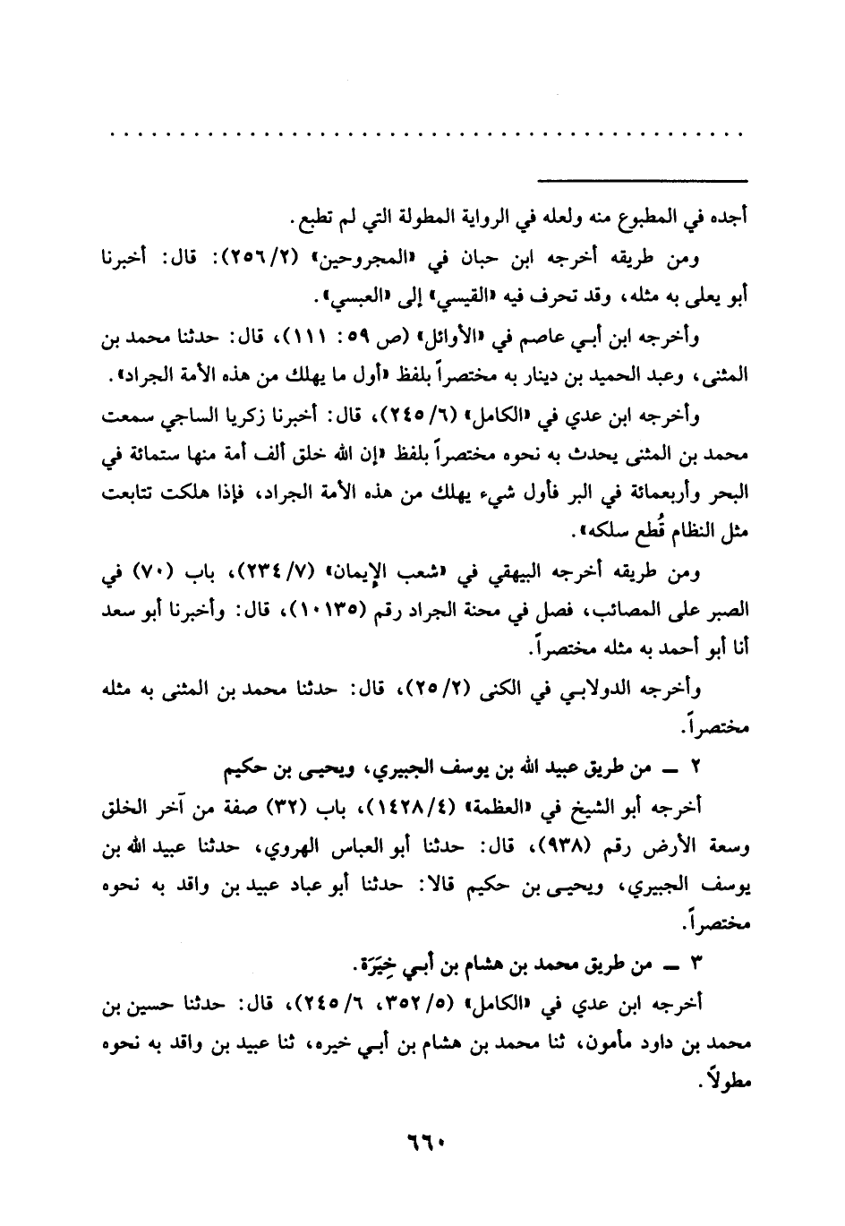 وأخرجه ابن أبي عاصم في "الأوائل" (ص 59: 111)، قال: حدّثنا محمَّد بن المثنى، وعبد الحميد بن دينار به مختصرًا بلفظ "أول ما يهلك من هذه الأمة الجراد".