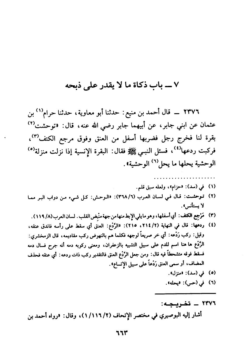 2376 - قَالَ أَحْمَدُ بْنُ مَنِيعٍ حَدَّثَنَا أَبُو مُعَاوِيَةَ حَدَّثَنَا حَرَامُ بْنُ عُثْمَانَ عَنِ ابْنَيْ جَابِرٍ عَنْ أَبِيهِمَا جَابِرٍ رَضِيَ الله عَنْهُ قَالَ تَوَحَّشَتْ بَقَرَةٌ لَنَا فَخَرَجَ رَجُلٌ فَضَرَبَهَا أَسْفَلَ مِنَ الْعُنُقِ وَفَوْقَ مَرْجِعِ الْكَتِفِ فَرَكِبَتْ رَدْعَهَا فَسُئِلَ النَّبِيُّ صَلَّى اللَّهُ عَلَيْهِ وَسَلَّمَ فَقَالَ §الْبَقَرَةُ الْإِنْسِيَّةَ إِذَا نَزَلَتْ مَنْزِلَةَ الْوَحْشِيَّةِ يُحِلُّهَا مَا يُحِلُّ الْوَحْشِيَّةَ