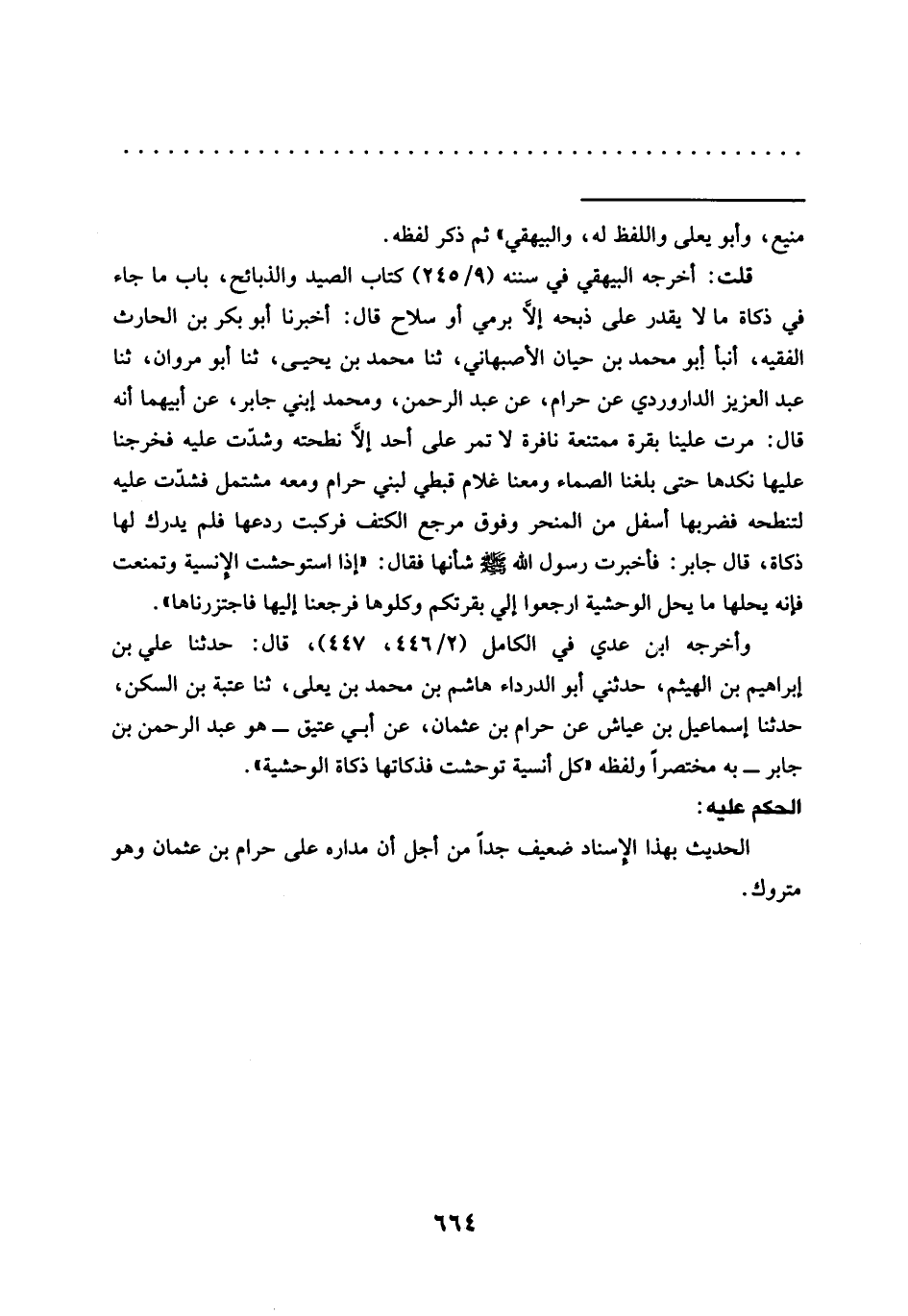 وأخرجه ابن عدي في الكامل (2/ 446، 447)، قال: حدّثنا علي بن إبراهيم بن الهيثم، حدثني أبو الدرداء هاشم بن محمد بن يعلى، ثنا عتبة بن السكن، حدّثنا إِسْمَاعِيلُ بْنُ عَيَّاشٍ عَنْ حَرَامِ بْنِ عُثْمَانَ، عن أبي عتيق -هو عبد الرحمن بن جابر- به مختصرًا ولفظه "كل أنسية توحشت فذكاتها ذكاة الوحشية".