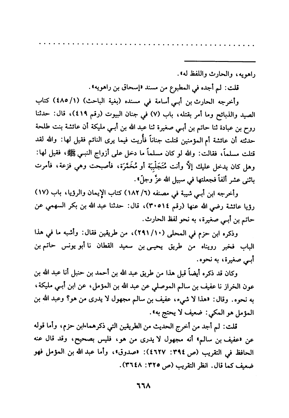 وأخرجه ابن أبي شيبة في مصنفه (6/ 182) كتاب الإيمان والرؤيا، باب (17) رؤيا عائشة رضي الله عنها (رقم 30514)، قال: حدّثنا عبد الله بن بكر السهمي عن حاتم بن أبي صغيرة، به نحو لفظ الحارث.