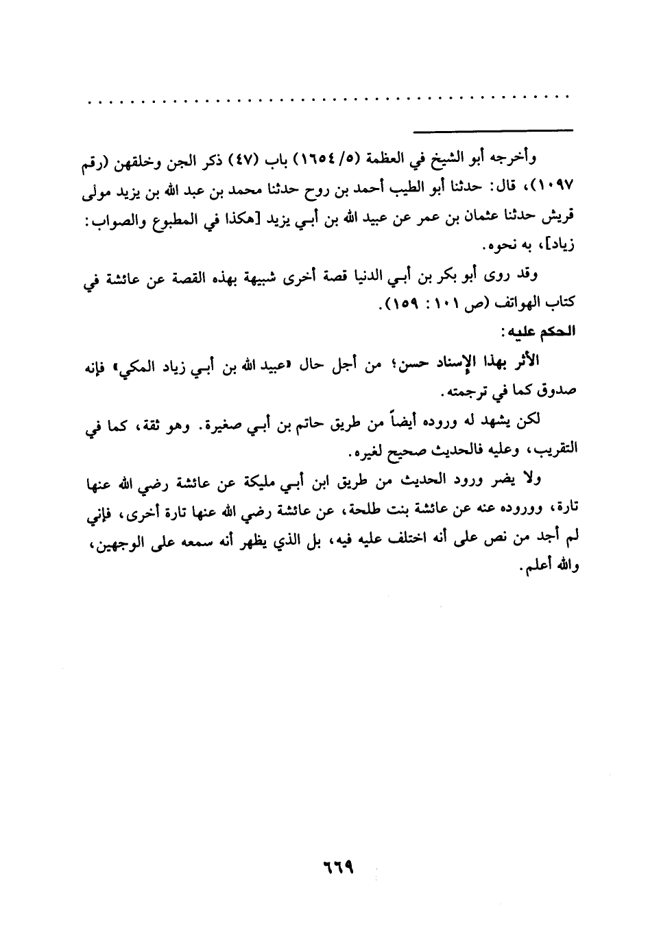 = وأخرجه أبو الشيخ في العظمة (5/ 1654) باب (47) ذكر الجن وخلقهن (رقم 1097)، قال: حدّثنا أبو الطيب أحمد بن روح حدّثنا محمَّد بن عبد الله بن يزيد مولى قريش حدّثنا عثمان بن عمر عن عبيد الله بن أبي يزيد [هكذا في المطبوع والصواب: زياد]، به نحوه.