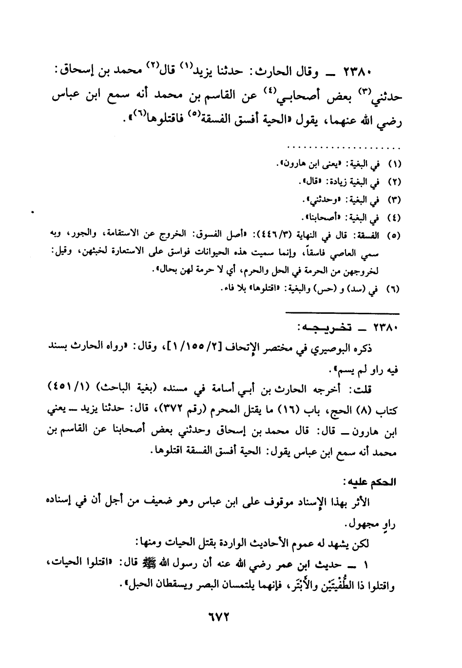 2380 - وَقَالَ الْحَارِثُ حَدَّثَنَا يَزِيدُ قَالَ مُحَمَّدُ بْنُ إِسْحَاقَ حَدَّثَنِي بَعْضُ أصْحَابِي عَنِ الْقَاسِمِ بْنِ مُحَمَّدٍ أَنَّهُ سَمِعَ ابْنَ عَبَّاسٍ رَضِيَ الله عَنْهُمَا يَقُولُ §الْحَيَّةُ أَفْسَقُ الْفَسَقَةِ فَاقْتُلُوهَا