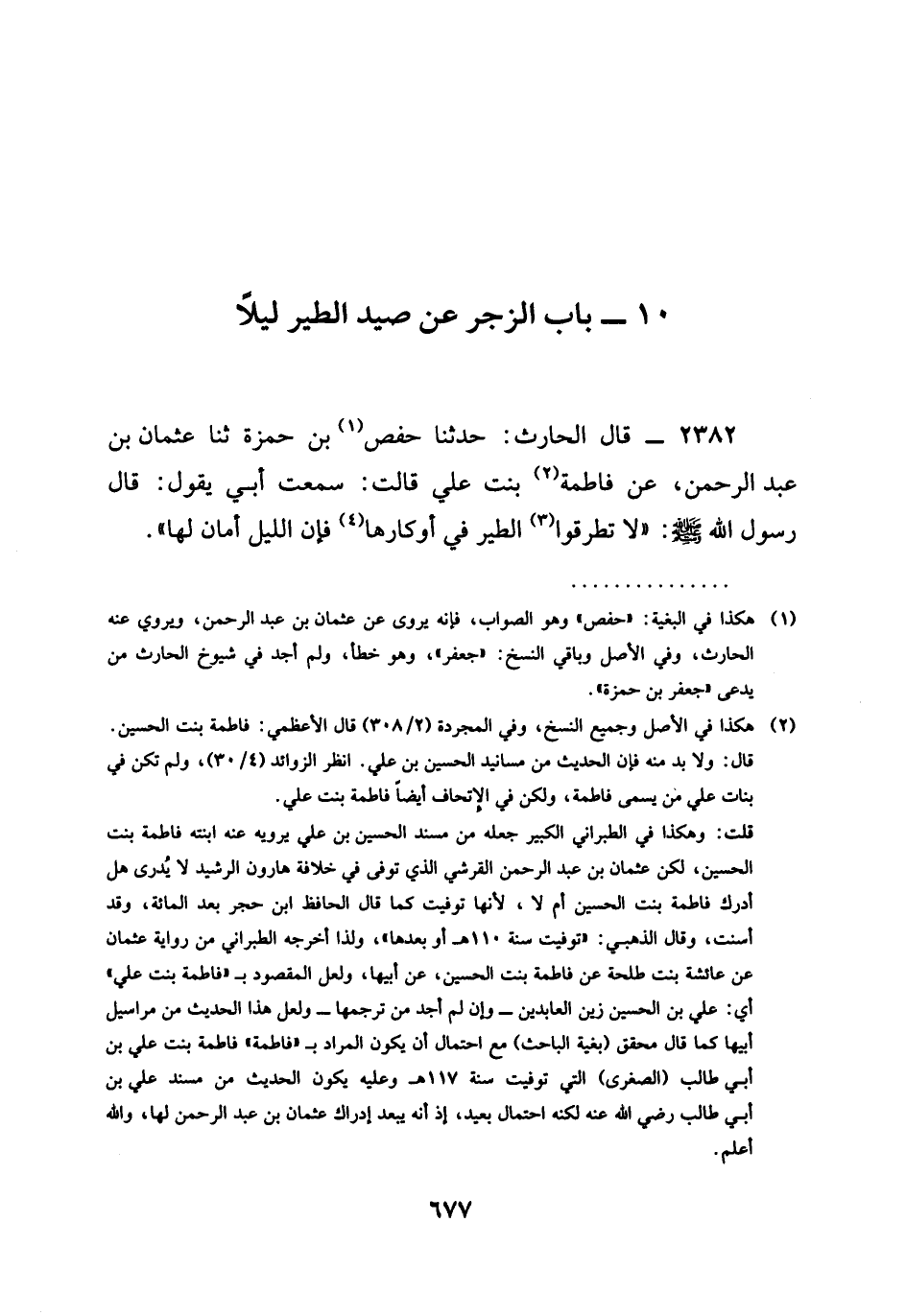 2382 - قَالَ الْحَارِثُ حَدَّثَنَا حَفْصُ بْنُ حَمْزَةَ ثنا عُثْمَانُ بْنُ عَبْدِ الرَّحْمَنِ عَنْ فَاطِمَةَ بِنْتِ عَلِيٍّ قَالَتْ سَمِعْتُ أَبِي يَقُولُ قَالَ رَسُولُ اللَّهِ صَلَّى اللَّهُ عَلَيْهِ وَسَلَّمَ §لَا تَطْرُقُوا الطَّيْرَ فِي أَوْكَارِهَا فَإِنَّ اللَّيْلَ أَمَانٌ لَهَا