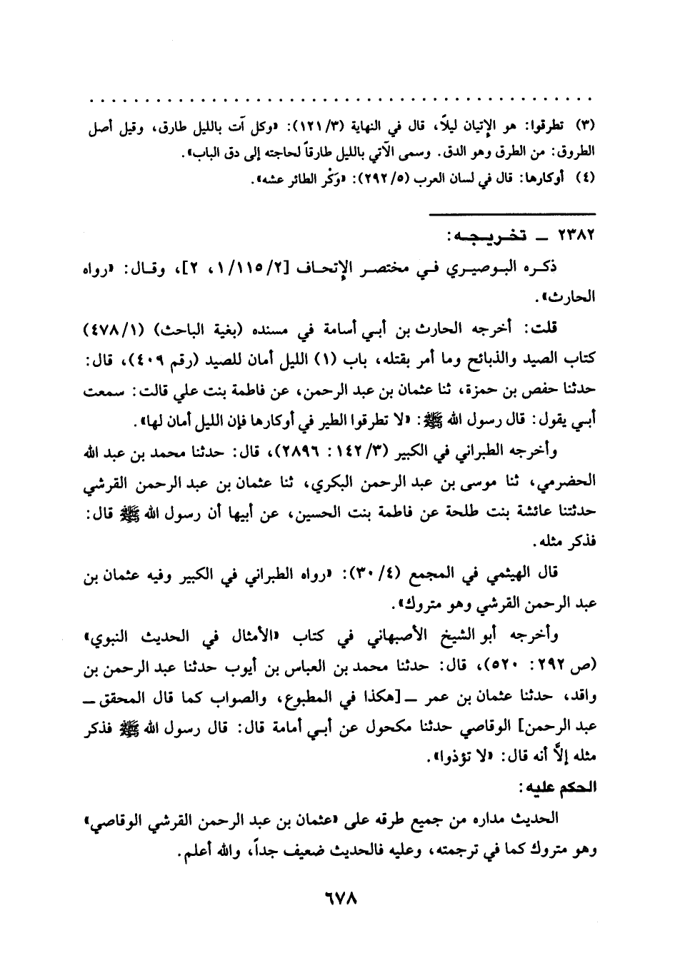 قلت: أخرجه الحارث بن أبي أسامة في مسنده (بغية الباحث) (1/ 478) كتاب الصيد والذبائح وما أمر بقتله، باب (1) الليل أمان للصيد (رقم 409)، قال: حَدَّثَنَا حَفْصُ بْنُ حَمْزَةَ، ثنا عُثْمَانُ بْنُ عَبْدِ الرَّحْمَنِ، عَنْ فَاطِمَةَ بِنْتِ عَلِيٍّ قَالَتْ: سَمِعْتُ أَبِي يَقُولُ: قَالَ رَسُولُ اللَّهِ -صَلَّى اللَّهُ عَلَيْهِ وَسَلَّمَ-: "لَا تَطْرُقُوا الطَّيْرَ فِي أوكارها فإن الليل أمان لها".