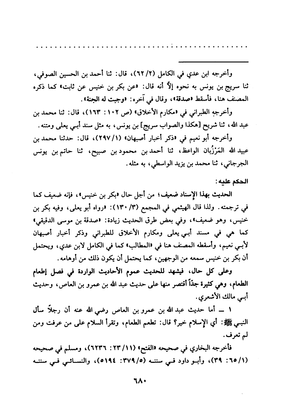 وعلى كل حال، فيشهد للحديث عموم الأحاديث الواردة في فصل إطعام الطعام، وهي كثيرة جدًّا أقتصر منها على حَدِيثِ عَبْدِ اللَّهِ بْنِ عَمْرِو بْنِ الْعَاصِ، وحديث أبي مالك الأشعري.