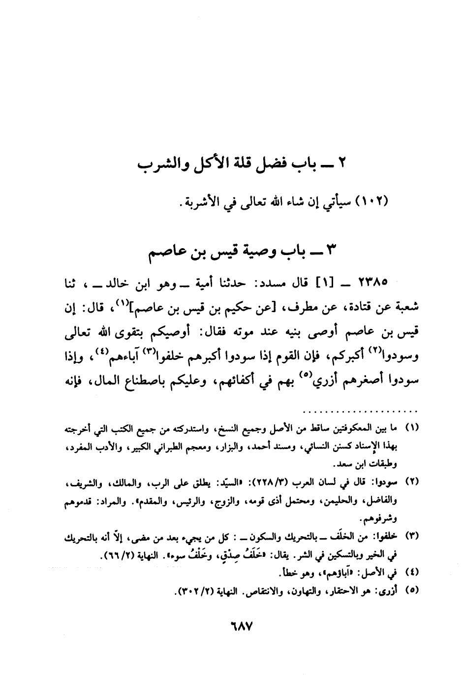 2385 - قَالَ مُسَدَّدٌ حَدَّثَنَا أُمَيَّةُ وَهُوَ ابْنُ خَالِدٍ ثنا شُعْبَةُ عَنْ قَتَادَةَ عَنْ مُطَرِّفٍ عَنْ حَكِيمِ بْنِ قَيْسِ بْنِ عَاصِمٍ قَالَ إِنَّ قَيْسَ بْنَ عَاصِمٍ أَوْصَى بَنِيهِ عِنْدَ مَوْتِهِ فَقَالَ أُوصِيكُمْ بِتَقْوَى اللَّهِ تَعَالَى §وَسَوِّدُوا أكبرهم فَإِنَّ الْقَوْمَ إِذَا سَوَّدُوا أَكْبَرَهُمْ خَلَفُوا آبائهم وَإِذَا سَوَّدُوا أَصْغَرَهُمُ أزْرِيَ بِهِمْ فِي أَكْفَائِهِمْ وَعَلَيْكُمْ بِاصْطِنَاعِ الْمَالِ فَإِنَّهُ