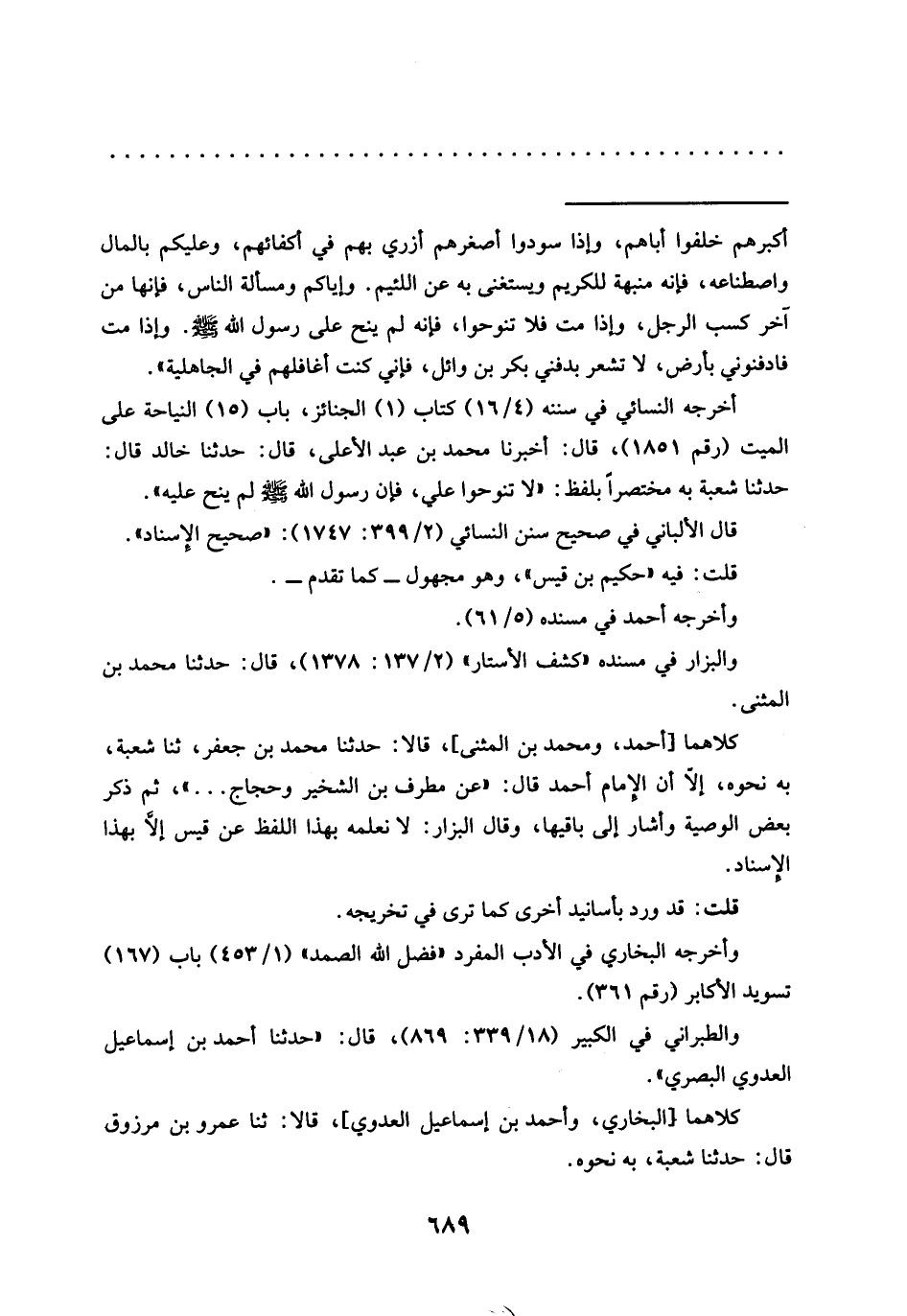 أخرجه النسائي في سننه (4/ 16) كتاب (1) الجنائز، باب (15) النياحة على الميت (رقم 1851)، قال: أخبرنا محمَّد بن عبد الأعلى، قال: حدّثنا خالد قال: حدّثنا شعبة به مختصرًا بلفظ: "لا تنوحوا علي، فَإِنَّ رَسُولَ اللَّهِ -صَلَّى اللَّهُ عَلَيْهِ وَسَلَّمَ- لم ينح عليه".