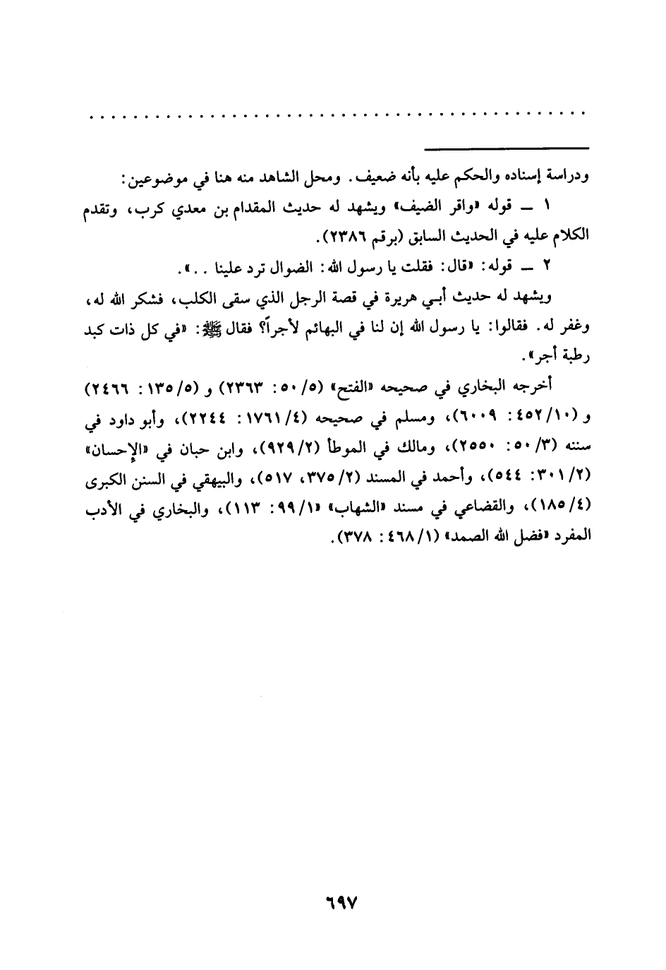 1 - قوله "واقر الضيف" ويشهد له حديث المقدام بن معدي كرب، وتقدم الكلام عليه في الحديث السابق (برقم 2386).