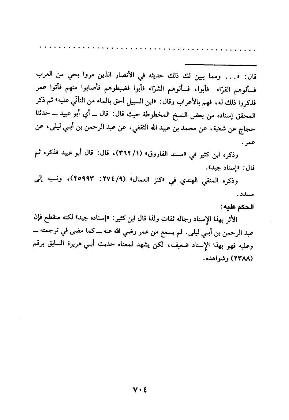 = قال: " ... ومما يبين لك ذلك حديثه في الأنصار الذين مروا بحي من العرب فسألوهم القرّاء فأبوا، فسألوهم الشرّاء فأبوا فضبطوهم فأصابوا منهم فأتوا عمر فذكروا ذلك له، فهم بالأعراب وقال: "ابن السبيل أحق بالماء من التأني عليه" ثم ذكر المحقق إسناده من بعض النسخ المخطوطة حيث قال: قال -أي أبو عبيد- حدّثنا حجاج عَنْ شُعْبَةَ، عَنْ محمَّد بْنِ عُبَيْدِ اللَّهِ الثقفي، عَنْ عَبْدِ الرَّحْمَنِ بْنِ أَبِي لَيْلَى، عَنْ عمر.
