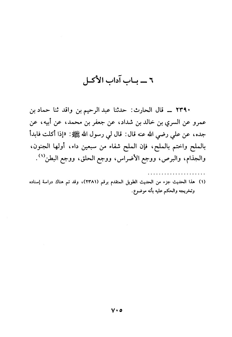 2390 - قَالَ الْحَارِثُ حَدَّثَنَا عَبْدُ الرَّحِيمِ بْنُ وَاقِدٍ ثنا حَمَّادُ بْنُ عَمْرٍو عَنِ السَّرِيِّ بْنِ خَالِدِ بْنِ شَدَّادٍ عَنْ جَعْفَرِ بْنِ مُحَمَّدٍ عَنْ أَبِيهِ عَنْ جَدِّهِ عَنْ عَلِيٍّ رَضِيَ الله عَنْهُ قَالَ قَالَ لِي رَسُولُ اللَّهِ صَلَّى اللَّهُ عَلَيْهِ وَسَلَّمَ §إِذَا أَكَلْتَ فَابْدَأْ بِالْمِلْحِ وَاخْتِمْ بِالْمِلْحِ فَإِنَّ الْمِلْحَ شِفَاءُ مِنْ سَبْعِينَ دَاءٍ أَوَّلُهَا الْجُنُونِ وَالْجُذَامِ وَالْبَرَصِ وَوَجَعِ الْأَضْرَاسِ وَوَجَعِ الْحَلْقِ وَوَجَعِ الْبَطْنِ