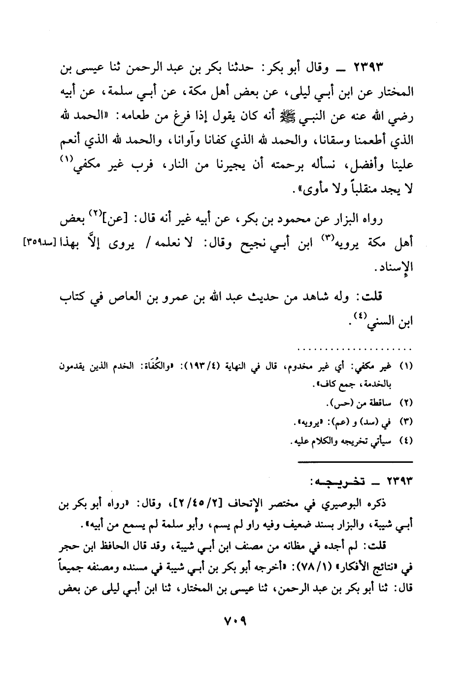 2393 - وَقَالَ أَبُو بَكْرٍ حَدَّثَنَا بَكْرُ بْنُ عَبْدِ الرَّحْمَنِ ثنا عِيسَى بْنُ الْمُخْتَارِ عَنِ ابْنِ أَبِي لَيْلَى عَنْ بَعْضِ أَهْلِ مَكَّةَ عَنْ أَبِي سَلَمَةَ عَنْ أَبِيهِ رَضِيَ الله عَنْهُ عَنِ النَّبِيِّ صَلَّى اللَّهُ عَلَيْهِ وَسَلَّمَ أَنَّهُ كَانَ يَقُولُ إِذَا فَرَغَ مِنْ طَعَامِهِ §الْحَمْدُ لِلَّهِ الَّذِي أَطْعَمَنَا وَسَقَانَا وَالْحَمْدُ لِلَّهِ الَّذِي كَفَانَا وَآوَانَا وَالْحَمْدُ لِلَّهِ الَّذِي أَنْعَمَ عَلَيْنَا وَأَفْضَلَ نَسْأَلُهُ بِرَحْمَتِهِ أَنْ يُجِيرَنَا مِنَ النَّارِ فَرُبَّ غَيْرِ مَكْفِيٍّ لَا يَجِدُ مُنْقَلَبًا وَلَا مَأْوًى رَوَاهُ الْبَزَّارُ عَنْ مَحْمُودِ بْنِ بَكْرٍ عَنْ أَبِيهِ غَيْرَ أَنَّهُ قَالَ عَنْ بَعْضِ أَهْلِ مَكَّةَ يَرْوِيهِ ابْنُ أَبِي نَجِيحٍ وَقَالَ لَا نَعْلَمُهُ يُرْوَى إِلَّا بِهَذَا الْإِسْنَادِ قُلْتُ وَلَهُ شَاهِدٌ مِنْ حَدِيثِ عَبْدِ اللَّهِ بْنِ عَمْرِو بْنِ الْعَاصِ فِي كِتَابِ ابْنِ السُّنِّيِّ