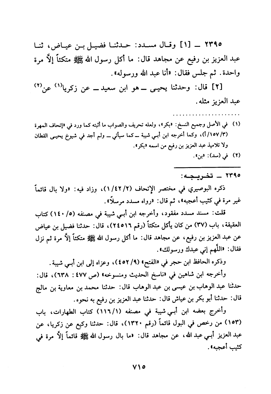 2395 - وَقَالَ مُسَدَّدٌ حَدَّثَنَا فُضَيْلُ بْنُ عِيَاضٍ ثنا عَبْدُ الْعَزِيزِ بْنُ رُفَيْعٍ عَنْ مُجَاهِدٍ قَالَ §مَا أَكَلَ رَسُولُ اللَّهِ صَلَّى اللَّهُ عَلَيْهِ وَسَلَّمَ مُتَّكِئًا إِلَّا مَرَّةً وَاحِدَةً ثُمَّ جَلَسَ فَقَالَ أَنَا عَبْدُ اللَّهِ وَرَسُولُهُ