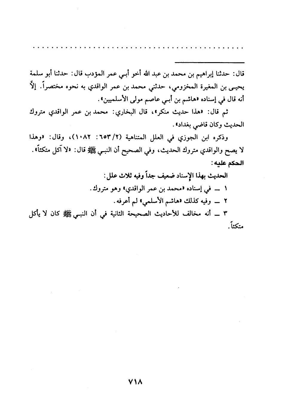 وذكره ابن الجوزي في العلل المتناهية (2/ 653: 1082)، وقال: "وهذا لا يصح والواقدي متروك الحديث، وفي الصحيح أن النبي -صلى الله عليه وسلم- قال: "لا آكل متكئًا".