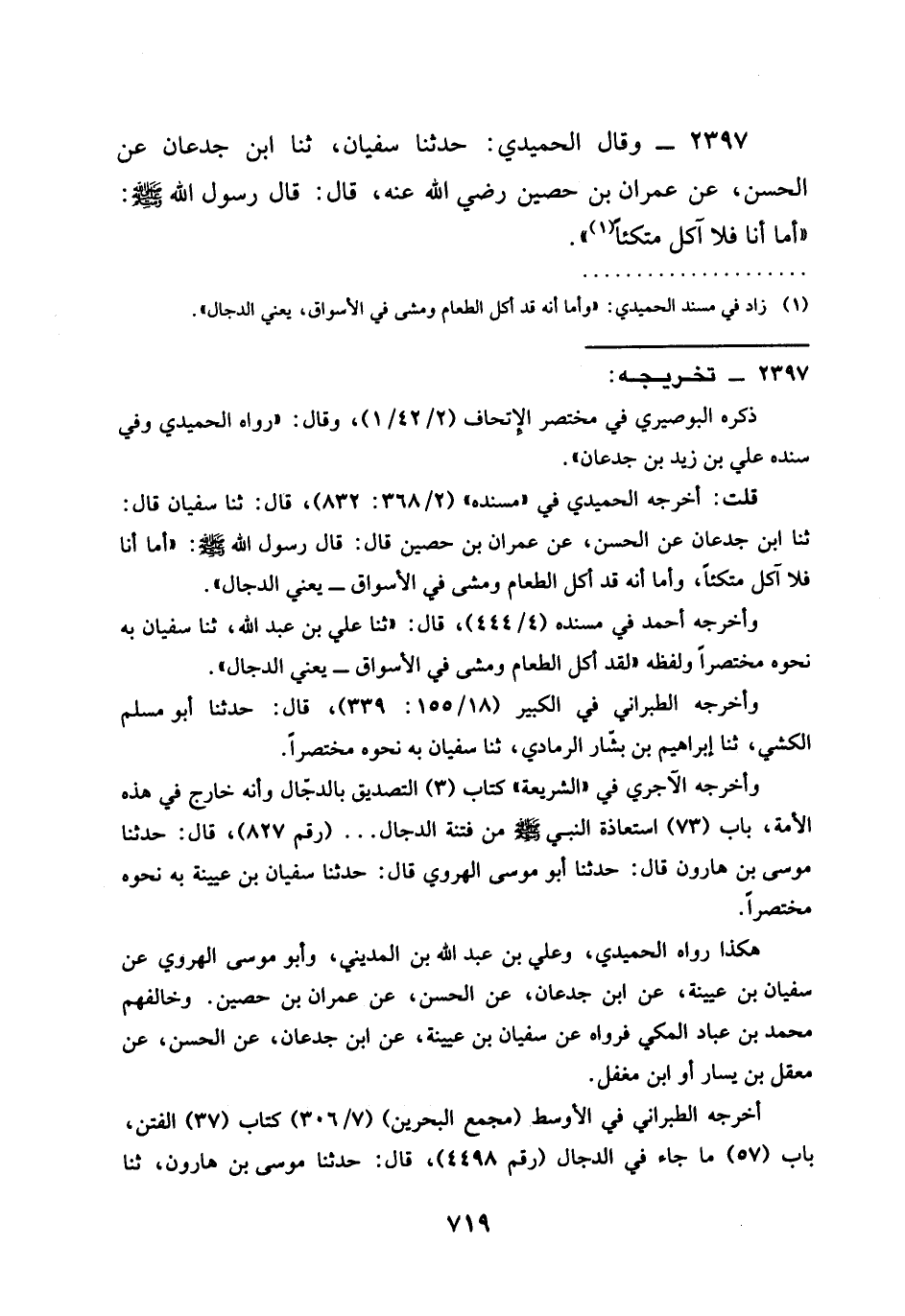 2397 - وَقَالَ الْحُمَيْدِيُّ حَدَّثَنَا سُفْيَانُ ثنا ابْنُ جُدْعَانَ عَنِ الْحَسَنِ عَنْ عِمْرَانَ بْنِ حُصَيْنٍ رَضِيَ الله عَنْهُ قَالَ قَالَ رَسُولُ اللَّهِ صَلَّى اللَّهُ عَلَيْهِ وَسَلَّمَ §أَمَّا أَنَا فَلَا آكُلُ مُتَّكِئًا