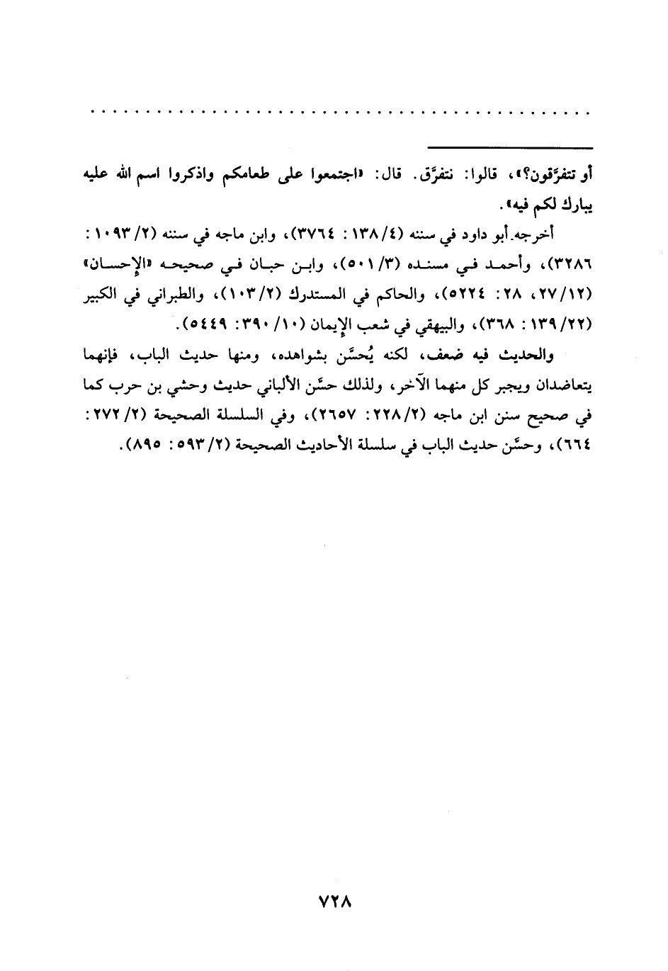 = أو تتفرَّقون؟ "، قالوا: نتفرَّق. قال: "اجتمعوا على طعامكم واذكروا اسم الله عليه يبارك لكم فيه".