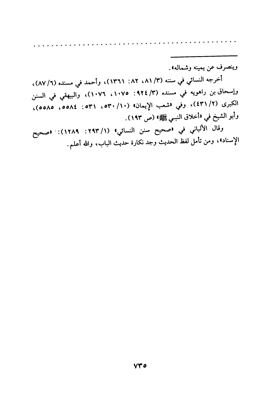 أخرجه النسائي في سننه (3/ 81، 82: 1361)، وأحمد في مسنده (6/ 87)، وإسحاق بن راهويه في مسنده (3/ 924: 1075، 1076)، والبيهقي في السنن الكبرى (2/ 431)، وفي "شعب الإيمان" (10/ 530، 531: 5584. 5585)، وأبو الشيخ في "أخلاق النبي -صلى الله عليه وسلم- " (ص 193).