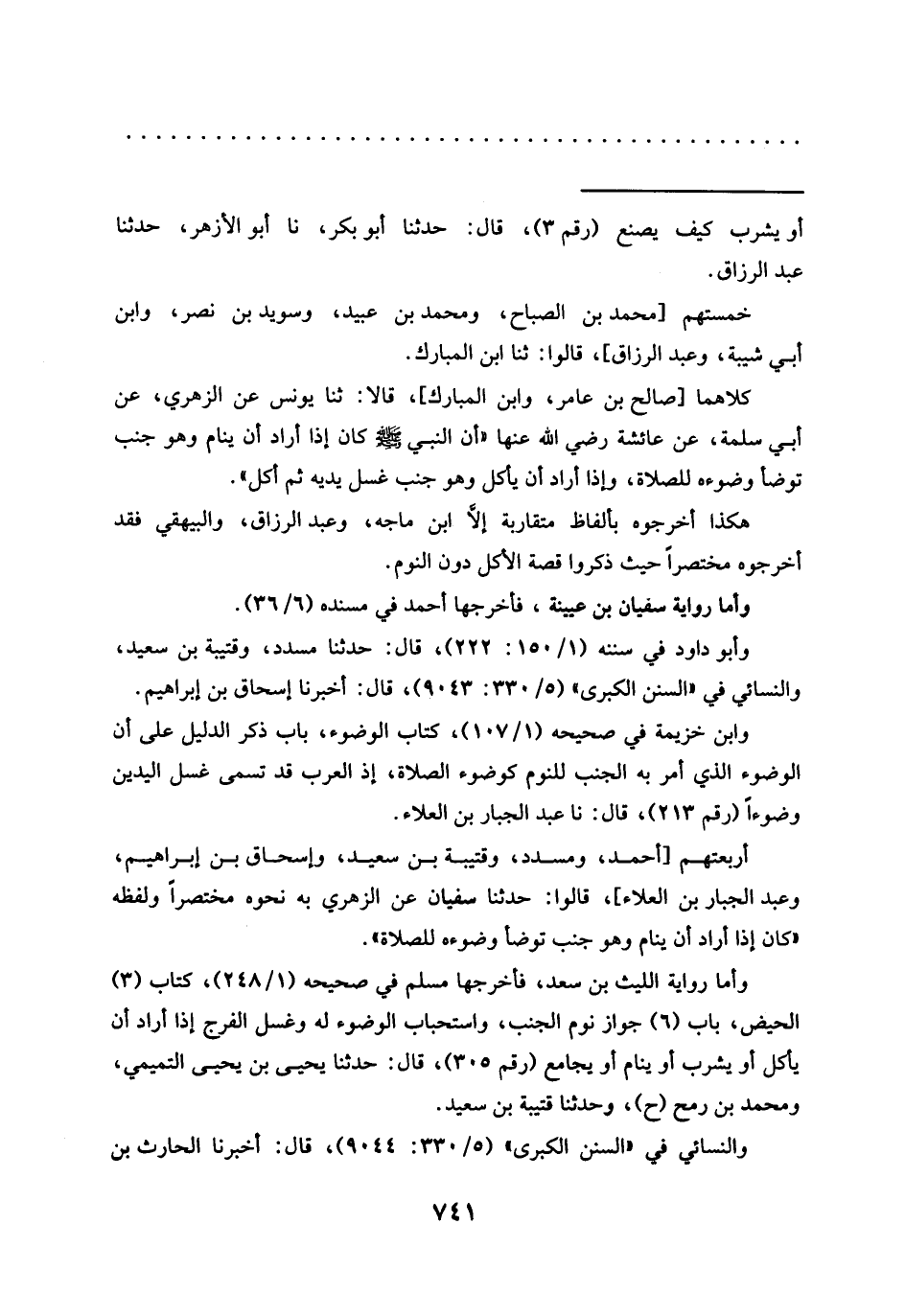 أربعتهم [أحمد، ومسدد، وقتيبة بن سعيد، وإسحاق بن إبراهيم، وعبد الجبار بن العلاء]، قالوا: حدّثنا سفيان عن الزهري به نحوه مختصرًا ولفظه "كان إذا أراد أن ينام وهو جنب توضأ وضوءه للصلاة".