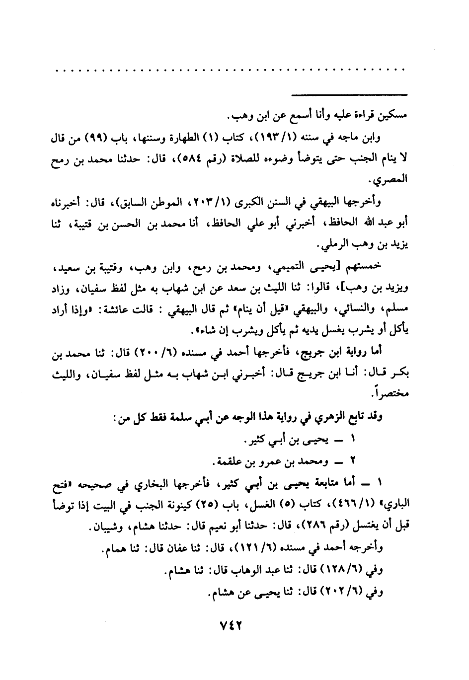 خمستهم [يحيى التميمي، ومحمد بن رمح، وابن وهب، وقتيبة بن سعيد، ويزيد بن وهب]، قالوا: ثنا الليث بن سعد عن ابن شهاب به مثل لفظ سفيان، وزاد مسلم، والنسائي، والبيهقي "قيل أن ينام" ثم قال البيهقي: قالت عائشة:"وإذا أراد يأكل أو يشرب يغسل يديه ثم يأكل ويشرب إن شاء".