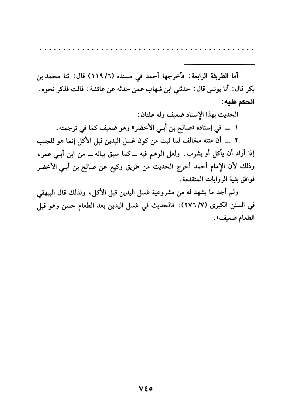2 - أن متنه مخالف لما ثبت من كون غسل اليدين قبل الأكل إنما هو للجنب إذا أراد أن يأكل أو يشرب. ولعل الوهم فيه -كما سبق بيانه- من ابن أبي عمر، وذلك لأن الإِمام أحمد أخرج الحديث من طريق وكيع عن صالح بن أبي الأخضر فوافق بقية الروايات المتقدمة.