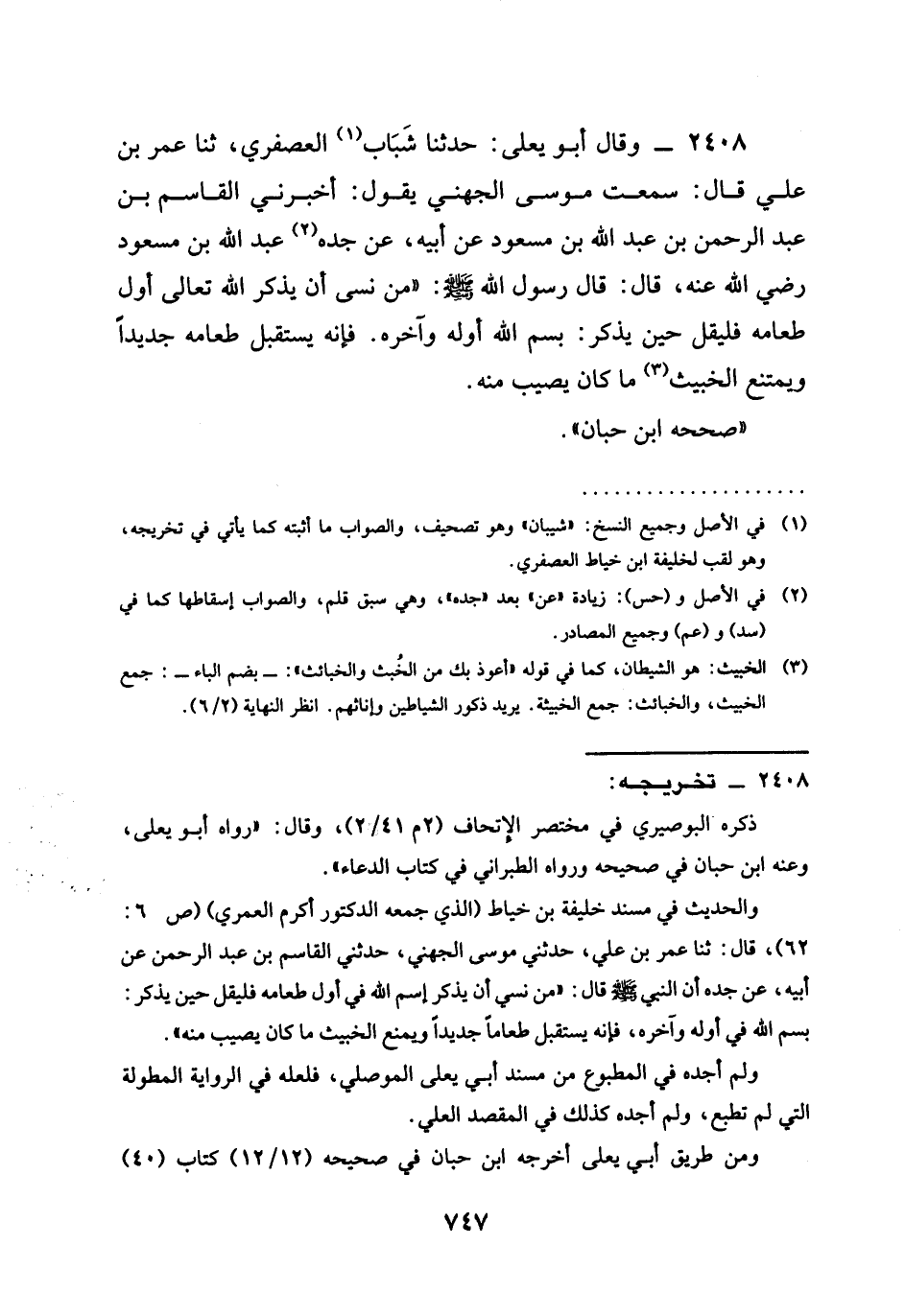 2408 - وَقَالَ أَبُو يَعْلَى حَدَّثَنَا شَبَابٌ الْعُصْفُرِيُّ ثنا عُمَرُ بْنُ عَلِيٍّ قَالَ سَمِعْتُ مُوسَى الْجُهَنِيَّ يَقُولُ أَخْبَرَنِي الْقَاسِمُ بْنُ عَبْدِ الرَّحْمَنِ بْنِ عَبْدِ اللَّهِ بْنِ مَسْعُودٍ عَنْ أَبِيهِ عَنْ جَدِّهِ عَبْدِ اللَّهِ بْنِ مَسْعُودٍ رَضِيَ الله عَنْهُ قَالَ قَالَ رَسُولُ اللَّهِ صَلَّى اللَّهُ عَلَيْهِ وَسَلَّمَ §مَنْ نَسِيَ أَنْ يَذْكُرَ اللَّهَ تَعَالَى أَوَّلَ طَعَامِهِ فَلْيَقُلْ حِينَ يَذْكُرُ بِسْمِ اللَّهِ أَوَّلَهُ وَآخِرَهُ فَإِنَّهُ يَسْتَقْبِلُ طَعَامَهُ جَدِيدًا وَيَمْتَنِعُ الْخَبِيثَ مَا كَانَ يُصِيبُ مِنْهُ