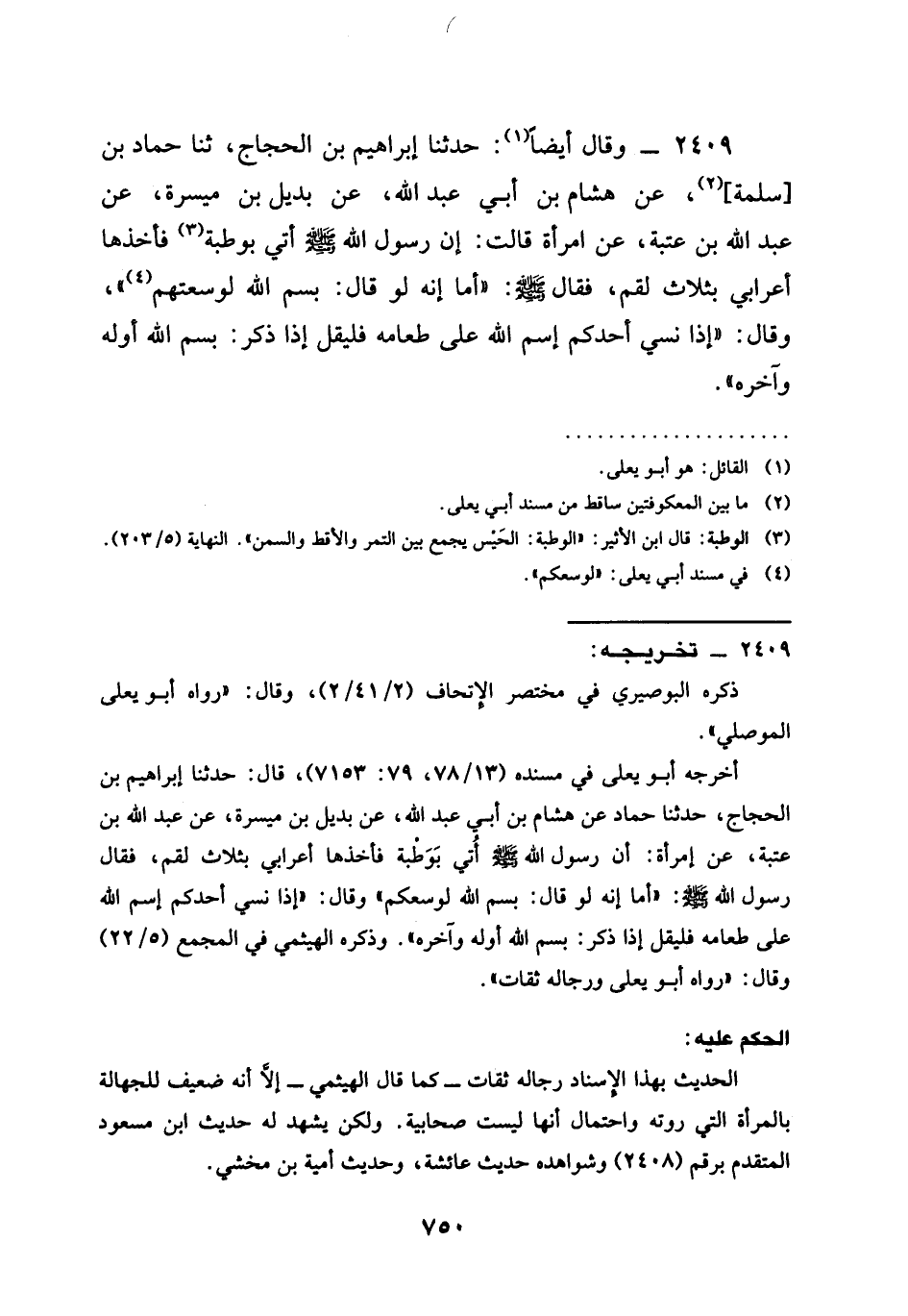 2409 - وَقَالَ أَيْضًا حَدَّثَنَا إِبْرَاهِيمُ بْنُ الْحَجَّاجِ ثنا حَمَّادُ بْنُ سَلَمَةَ عَنْ هِشَامِ بْنِ أَبِي عَبْدِ اللَّهِ عَنْ بُدَيْلِ بْنِ مَيْسَرَةَ عَنْ عَبْدِ اللَّهِ بْنِ عُتْبَةَ عَنِ امْرَأَةٍ قَالَتْ إنَّ رَسُولَ اللَّهِ صَلَّى اللَّهُ عَلَيْهِ وَسَلَّمَ أُتِيَ بِوَطْبَةٍ فَأَخَذَهَا أَعْرَابِيٌّ بِثَلَاثِ لُقَمٍ فَقَالَ صَلَّى اللَّهُ عَلَيْهِ وَسَلَّمَ §أَمَا إِنَّهُ لَوْ قَالَ بِسْمِ اللَّهِ لَوَسِعَتْهُمْ وَقَالَ إِذَا نَسِيَ أَحَدُكُمُ اسْمَ اللَّهِ عَلَى طَعَامِهِ فَلْيَقُلْ إِذَا ذَكَرَ بِسْمِ اللَّهِ أَوَّلَهُ وَآخِرَهُ
