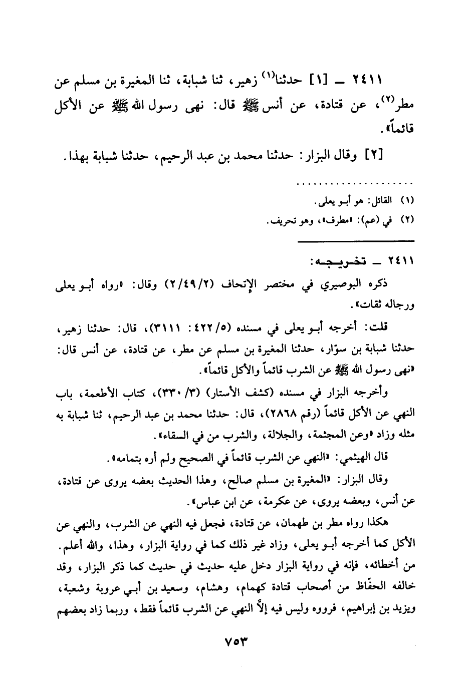 2411 - حَدَّثَنَا زُهَيْرٌ ثنا شَبَابَةُ ثنا الْمُغِيرَةُ بْنُ مُسْلِمٍ عَنْ مَطَرٍ عَنْ قَتَادَةَ عَنْ أَنَسٍ رَضِيَ الله عَنْه قَالَ §نَهَى رَسُولُ اللَّهِ صَلَّى اللَّهُ عَلَيْهِ وَسَلَّمَ عَنِ الْأَكْلِ قَائِمًا
