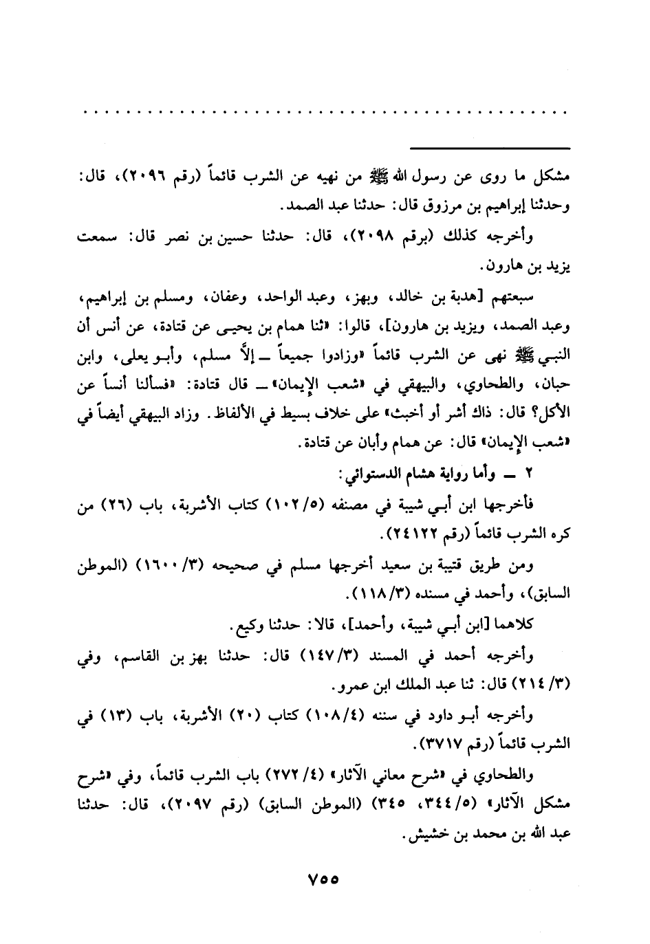 سبعتهم [هدبة بن خالد، وبهز، وعبد الواحد، وعفان، ومسلم بن إبراهيم، وعبد الصمد، ويزيد بن هارون]، قالوا: "ثنا هَمَّامُ بْنُ يَحْيَى عَنْ قَتَادَةَ، عَنْ أنس أن النبي -صلى الله عليه وسلم- نهى عن الشرب قائمًا "وزادوا جميعًا -إلَّا مسلم، وأبو يعلى، وابن حبّان، والطحاوي، والبيهقي في "شعب الإيمان"- قال قتادة: "فسألنا أنسًا عن الأكل؟ قال: ذاك أشر أو أخبث" على خلاف بسيط في الألفاظ. وزاد البيهقي أيضًا في "شعب الإيمان" قال: عن همام وأبان عن قتادة.