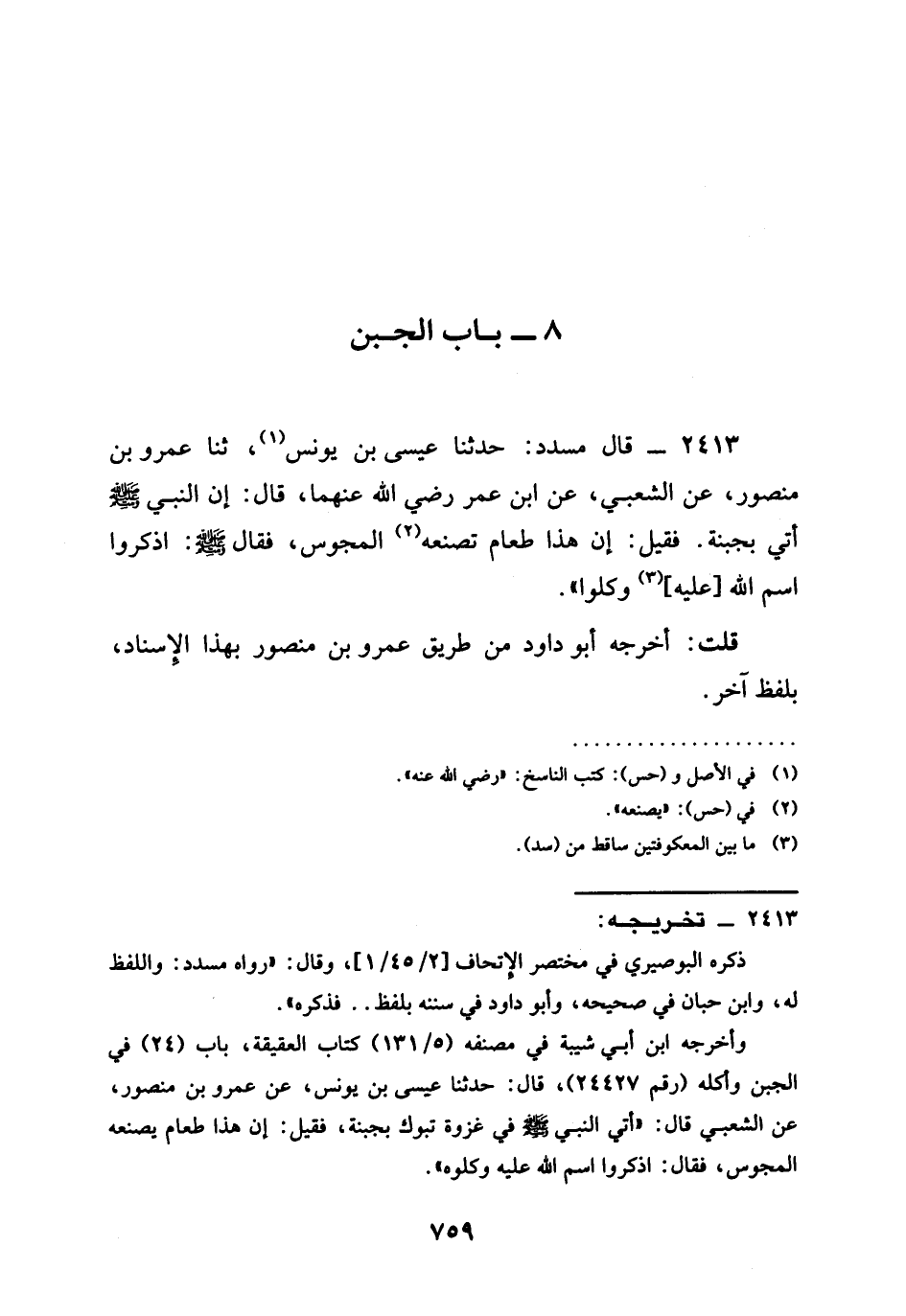 2413 - قَالَ مُسَدَّدٌ حَدَّثَنَا عِيسَى بْنُ يُونُسَ ثنا عَمْرُو بْنُ مَنْصُورٍ عَنِ الشَّعْبِيِّ عَنِ ابْنِ عُمَرَ رَضِيَ الله عَنْهُمَا قَالَ إنَّ النَّبِيَّ صَلَّى اللَّهُ عَلَيْهِ وَسَلَّمَ أُتِيَ بِجُبْنَةٍ فَقِيلَ إِنَّ هذه طَعَامٌ تَصْنَعُهُ الْمَجُوسُ فَقَالَ صَلَّى اللَّهُ عَلَيْهِ وَسَلَّمَ §اذْكُرُوا اسْمَ اللَّهِ عَلَيْهِ وَكُلُوا قُلْتُ أَخْرَجَهُ أَبُو دَاوُدَ مِنْ طَرِيقِ عَمْرِو بْنِ مَنْصُورٍ بِهَذَا الْإِسْنَادِ بِلَفْظٍ آخَرَ