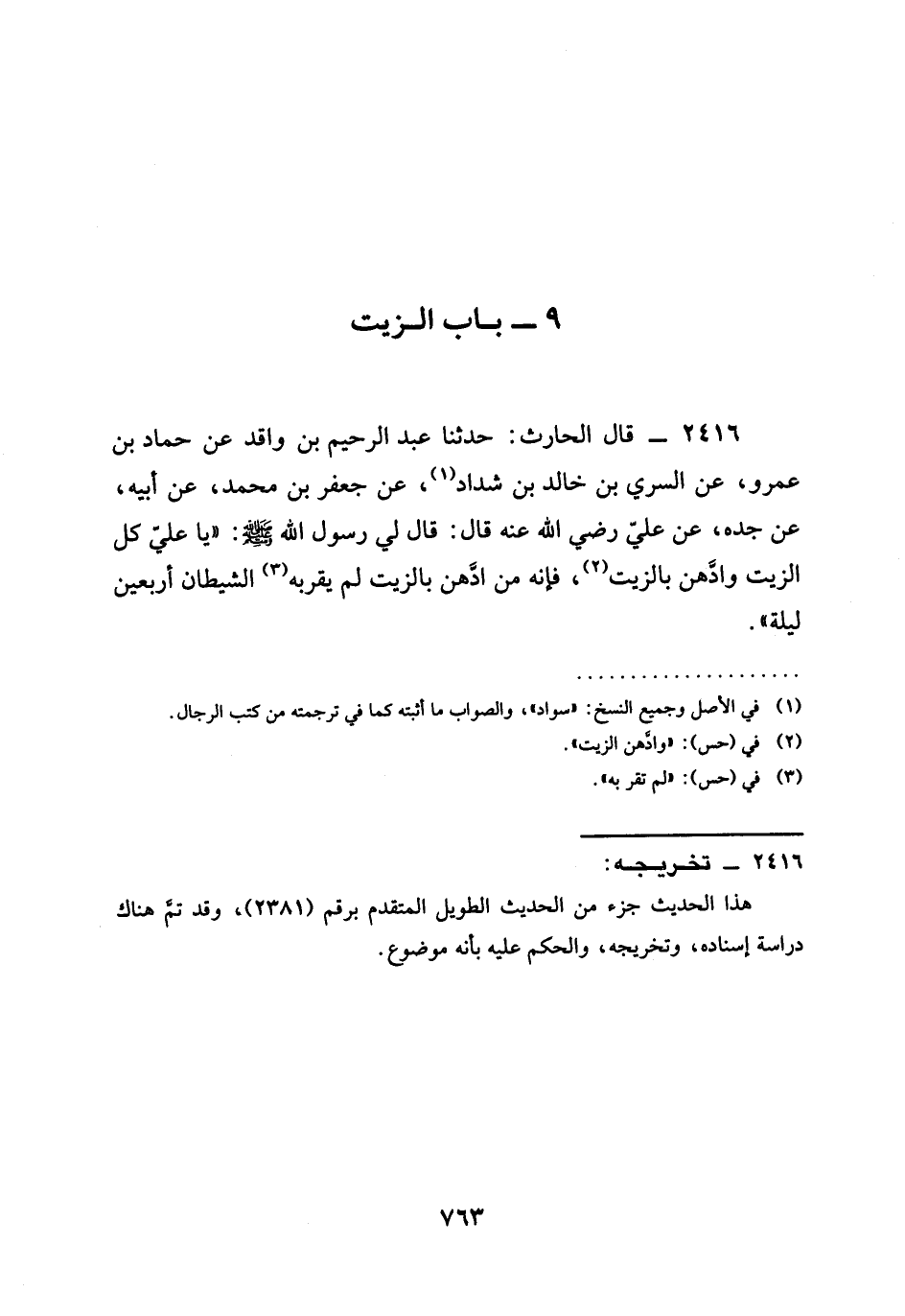 2416 - قَالَ الْحَارِثُ حَدَّثَنَا عَبْدُ الرَّحِيمِ بْنُ وَاقِدٍ عَنْ حَمَّادِ بْنِ عَمْرٍو عَنِ السَّرِيِّ بْنِ خَالِدِ بْنِ شَدَّادٍ عَنْ جَعْفَرِ بْنِ مُحَمَّدٍ عَنْ أَبِيهِ عَنْ جَدِّهِ عَنْ عَلِيٍّ رَضِيَ الله عَنْهُ قَالَ قَالَ لِي رَسُولُ اللَّهِ صَلَّى اللَّهُ عَلَيْهِ وَسَلَّمَ يَا عَلِيُّ §كُلِ الزَّيْتَ وَادَّهِنْ بِالزَّيْتِ فَإِنَّهُ مَنِ ادَّهَنَ بِالزَّيْتِ لَمْ يَقْرَبْهُ الشَّيْطَانُ أَرْبَعِينَ لَيْلَةً