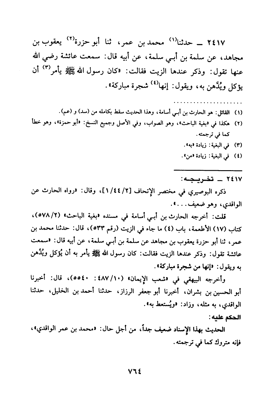 2417 - حَدَّثَنَا مُحَمَّدُ بْنُ عُمَرَ ثنا أَبُو حَزْرَةَ يَعْقُوبُ بْنُ مُجَاهِدٍ عَنْ سَلَمَةَ بْنِ أَبِي سَلَمَةَ عَنْ أَبِيهِ قَالَ سَمِعْتُ عَائِشَةَ رَضِيَ الله عَنْهَا تَقُولُ وَذُكِرَ عِنْدَهَا الزَّيْتُ فَقَالَتْ كَانَ رَسُولُ اللَّهِ صَلَّى اللَّهُ عَلَيْهِ وَسَلَّمَ يَأْمُرُ أَنْ يُؤْكَلَ وَيُدَّهَنَ بِهِ وَيَقُولُ §إِنَّهَا شَجَرَةٌ مُبَارَكَةٌ