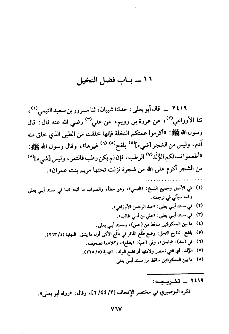 قَالَ أَبُو يَعْلَى حَدَّثَنَا شَيْبَانُ ثنا مَسْرُورُ بْنُ سَعِيدٍ التَّيْمِيُّ ثنا الْأَوْزَاعِيُّ عَنْ عُرْوَةَ بْنِ رُوَيْمٍ عَنْ عَلِيٍّ رَضِيَ الله عَنْهُ قَالَ قَالَ رَسُولُ اللَّهِ صَلَّى اللَّهُ عَلَيْهِ وَسَلَّمَ §أَكْرِمُوا عَمَّتَكُمُ النَّخْلَةَ فَإِنَّهَا خُلِقَتْ مِنَ الطِّينِ الَّذِي خُلِقَ مِنْهُ آدَمُ وَلَيْسَ من الشجر شئ يُلَقَّحُ غَيْرُهَا