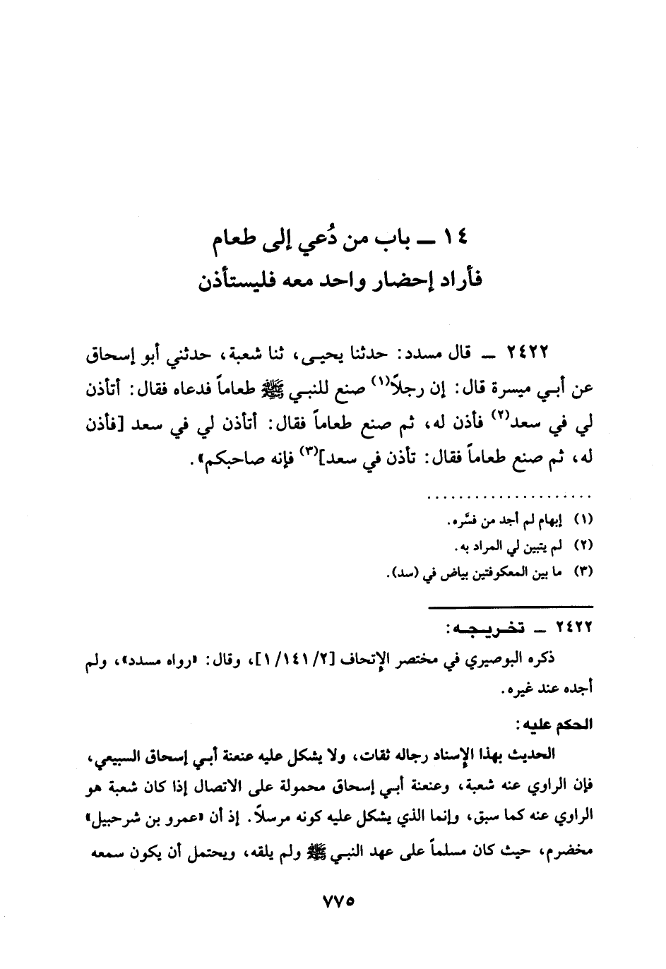 2422 - قَالَ مُسَدَّدٌ حَدَّثَنَا يَحْيَى ثنا شُعْبَةُ حَدَّثَنِي أَبُو إِسْحَاقَ عَنْ أَبِي مَيْسَرَةَ قَالَ إنَّ رَجُلًا صَنَعَ لِلنَّبِيِّ صَلَّى اللَّهُ عَلَيْهِ وَسَلَّمَ طَعَامًا فَدَعَاهُ فَقَالَ §أَتَأْذَنُ لِي فِي سَعْدٍ فَأَذِنَ لَهُ ثُمَّ صَنَعَ طَعَامًا فَقَالَ أَتَأْذَنُ لِي فِي سَعْدٍ فَأَذِنَ لَهُ ثُمَّ صَنَعَ طَعَامًا فَقَالَ تَأْذَنُ فِي سَعْدٍ فَإِنَّهُ صَاحِبُكُمْ