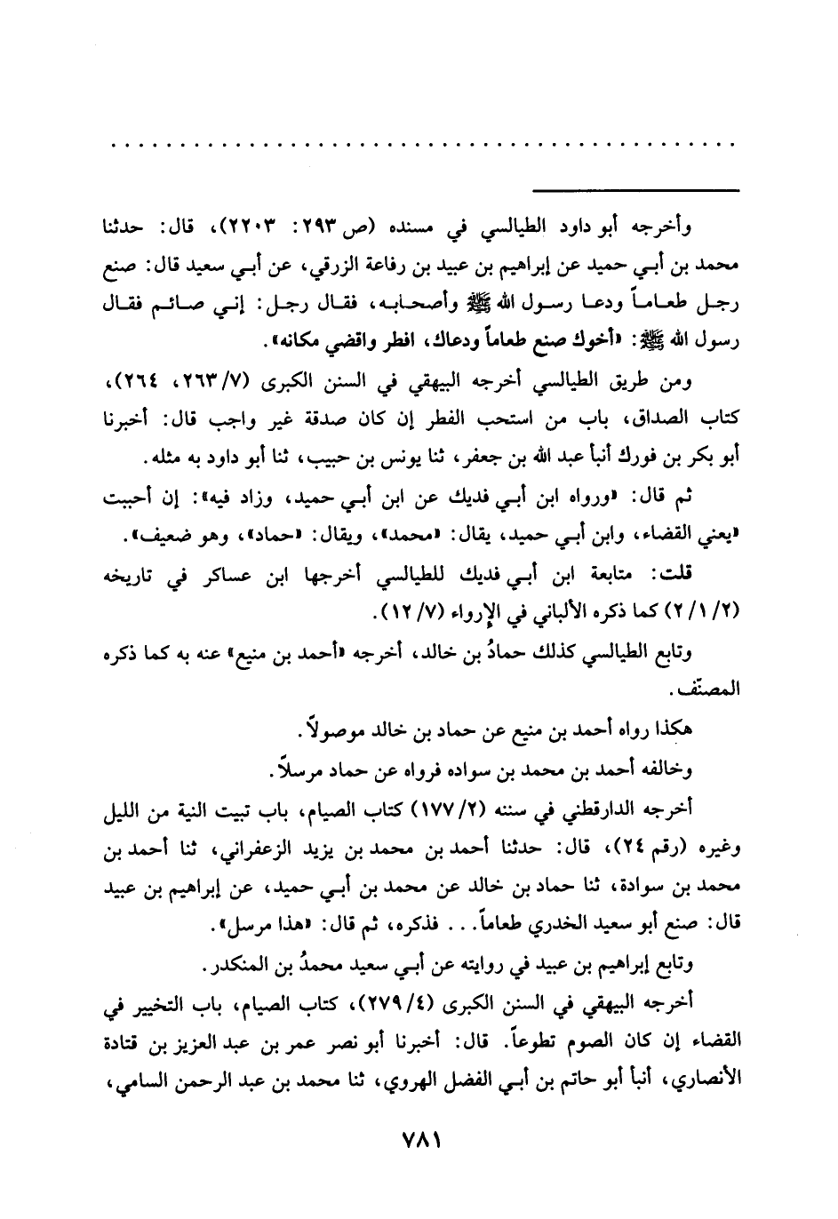 = وأخرجه أبو داود الطيالسي في مسنده (ص 293: 2203)، قال: حَدَّثَنَا محمَّد بْنُ أَبِي حُمَيْدٍ عَنْ إِبْرَاهِيمَ بن عبيد بن رفاعة الزرقي، عن أبي سعيد قَالَ: صَنَعَ رَجُلٌ طَعَامًا وَدَعَا رَسُولَ اللَّهِ -صَلَّى اللَّهُ عَلَيْهِ وَسَلَّمَ- وَأَصْحَابَهُ، فَقَالَ رَجُلٌ: إِنِّي صَائِمٌ فَقَالَ رَسُولُ اللَّهِ -صَلَّى اللَّهُ عَلَيْهِ وَسَلَّمَ-: "أَخُوكَ صَنَعَ طَعَامًا وَدَعَاكَ، أَفْطِرْ واقضي مكانه".