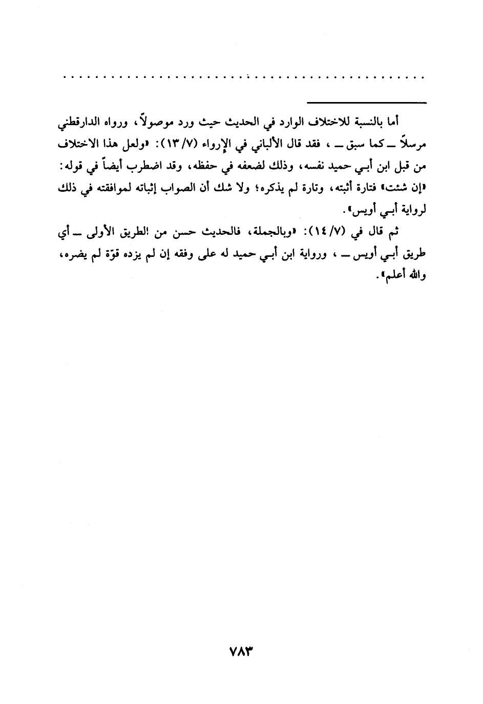 = أما بالنسبة للاختلاف الوارد في الحديث حيث ورد موصولًا، ورواه الدارقطني مرسلًا -كما سبق-، فقد قال الألباني في الإرواء (7/ 13): "ولعل هذا الاختلاف من قبل ابن أبي حميد نفسه، وذلك لضعفه في حفظه، وقد اضطرب أيضًا في قوله: "إن شئت" فتارة أثبته، وتارة لم يذكره؛ ولا شك أن الصواب إثباته لموافقته في ذلك لرواية أبي أويس".