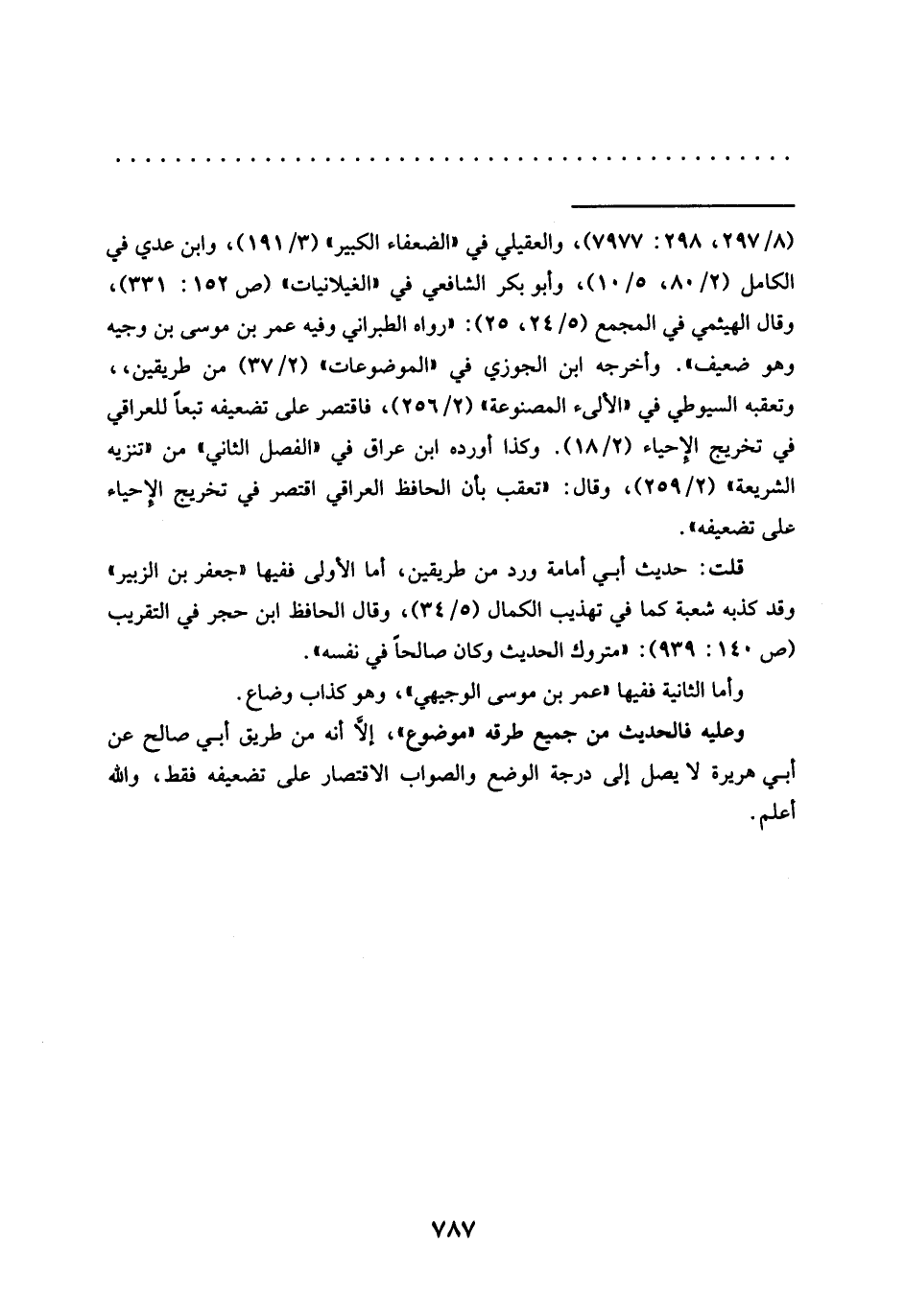 = (8/ 297، 298: 7977)، والعقيلي في "الضعفاء الكبير" (3/ 191)، وابن عدي في الكامل (2/ 80، 5/ 10)، وأبو بكر الشافعي في "الغيلانيات" (ص 152: 331)، وقال الهيثمي في المجمع (5/ 24، 25): "رواه الطبراني وفيه عمر بن موسى بن وجيه وهو ضعيف". وأخرجه ابن الجوزي في "الموضوعات" (2/ 37) من طريقين، وتعقبه السيوطي في "الألىء المصنوعة" (2/ 256)، فاقتصر على تضعيفه تبعًا للعراقي في تخريج الإحياء (2/ 18). وكذا أورده ابن عراق في "الفصل الثاني" من "تنزيه الشريعة، (2/ 259)، وقال: "تعقب بأن الحافظ العراقي اقتصر في تخريج الإحياء على تضعيفه".