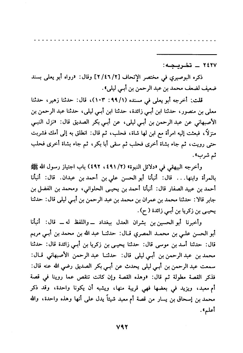 وأخبرنا أبو الحسين بن بشران العدل ببغداد -واللفظ له- قال: أنبأنا أبو الحسن علي بن محمَّد المصري قال: حدّثنا عبد الله بن محمَّد بن أبي مريم قال: حدّثنا أسد بن موسى قال: حدّثنا يحيي بن زكريا ابن أبي زائدة قال: حدّثنا مُحَمَّدُ بْنُ عَبْدِ الرَّحْمَنِ بْنِ أَبِي لِيَلَى قال: حدّثنا عبد الرحمن الأصبهاني قال: سمعت عبد الرحمن بن أبي ليلى يُحَدِّثُ عَنْ أَبِي بَكْرٍ الصِّدِّيقِ رَضِيَ اللَّهُ عَنْهُ قال: فذكر القصة مطولة ثم قال: "وهذه القصة وإن كانت تنقص عما روينا في قصة أم معبد، ويزيد في بعضها فهي قريبة منها، ويشبه أن يكونا واحدة، وقد ذكر محمَّد بن إسحاق بن يسار من قصة أم معبد شيئًا يدل على أنها وهذه واحدة، والله أعلم". =