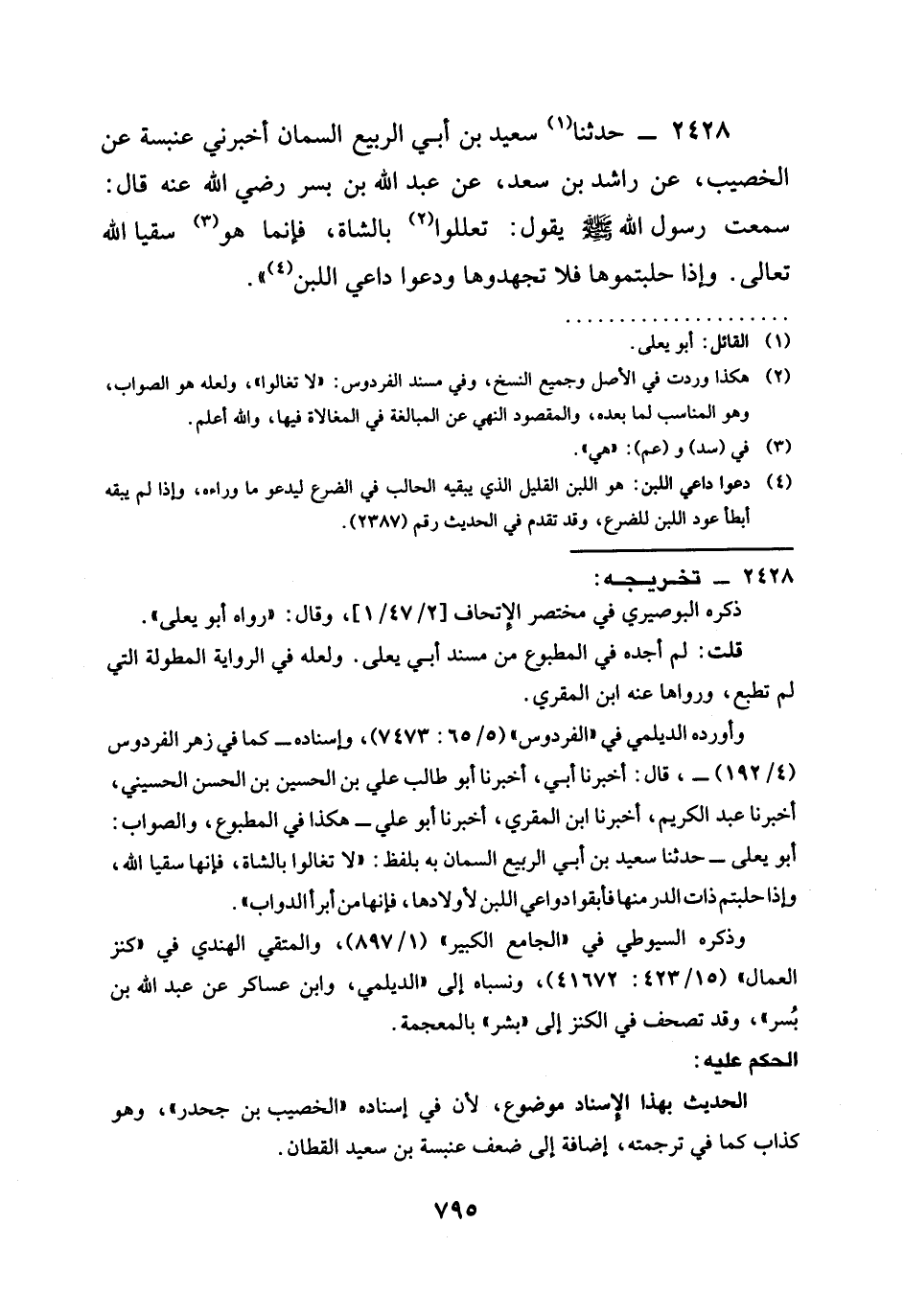 2428 - حَدَّثَنَا سَعِيدُ بْنُ أَبِي الرَّبِيعِ السَّمَّانُ أَخْبَرَنِي عَنْبَسَةُ عَنِ الْخُصَيْبِ عَنْ رَاشِدِ بْنِ سَعْدٍ عَنْ عَبْدِ اللَّهِ بْنِ رَضِيَ الله عَنْهُ قال سمعت رسولا لله صَلَّى اللَّهُ عَلَيْهِ وَسَلَّمَ يَقُولُ §تَعَلَّلُوا بالشاة فإنما هو سُقْيَا اللَّهِ تعالى وإذا بسر حَلَبْتُمُوهَا فَلَا تَجْهَدُوهَا دعوا دَاعِيَ اللَّبَنِ