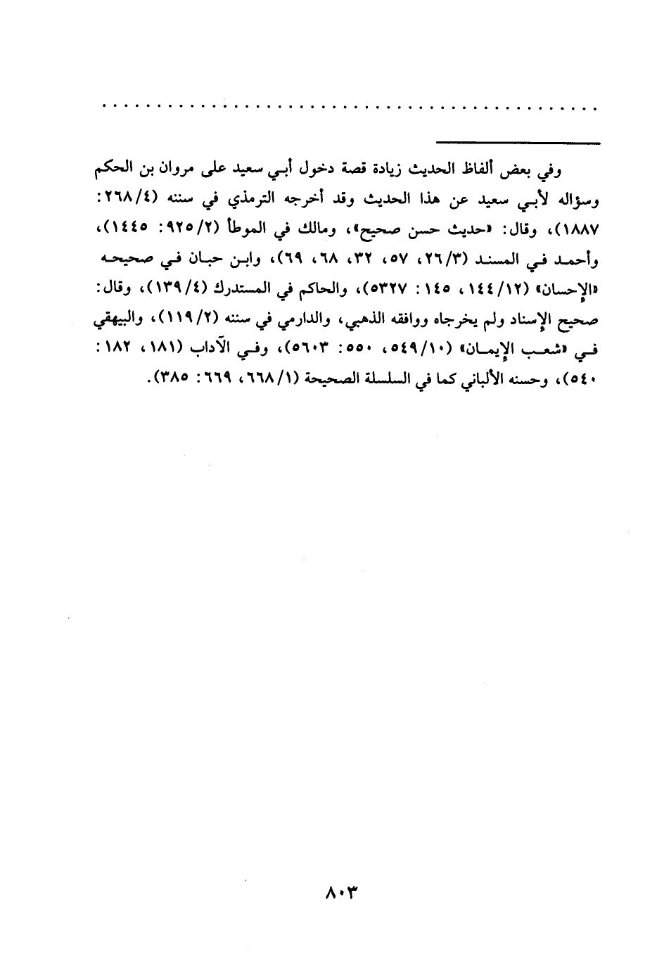 = وفي بعض ألفاظ الحديث زيادة قصة دخول أبي سعيد على مروان بن الحكم وسؤاله لأبي سعيد عن هذا الحديث وقد أخرجه الترمذي في سننه (4/ 268: 1887)، وقال: "حديث حسن صحيح"، ومالك في الموطأ (2/ 925: 1445)، وأحمد في المسند (3/ 26، 57، 32، 68، 69)، وابن حبّان في صحيحه "الإحسان" (12/ 144، 145: 5327)، والحاكم في المستدرك (4/ 139)، وقال: صحيح الإسناد ولم يخرجاه ووافقه الذهبي، والدارمي في سننه (2/ 119)، والبيهقي في "شعب الإيمان" (10/ 549, 550: 5603)، وفي الآداب (181، 182: 540)، وحسنه الألباني كما في السلسلة الصحيحة (1/ 668، 669: 385).