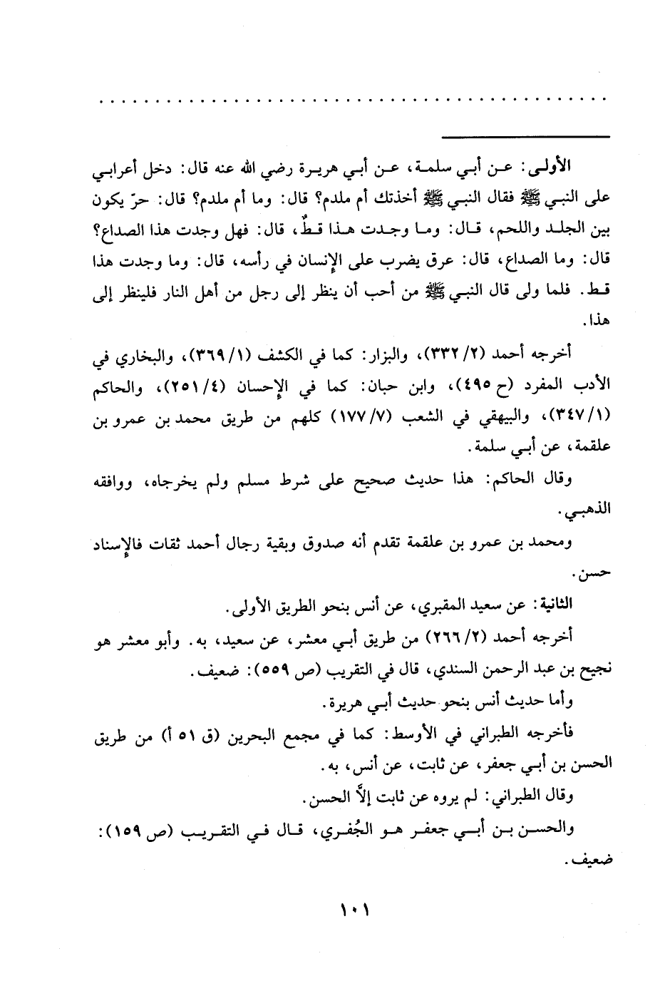 = الأولى: عَنْ أَبِي سَلَمَةَ، عَنْ أَبِي هُرَيْرَةَ رَضِيَ الله عنه قال: دخل أعرابي عَلَى النَّبِيِّ -صَلَّى اللَّهُ عَلَيْهِ وَسَلَّمَ- فَقَالَ النبي -صلى الله عليه وسلم- أخذتك أم ملدم؟ قال: وما أم ملدم؟ قال: حرّ يكون بين الجلد واللحم، قال: وما وجدت هذا قطٌ، قال: فهل وجدت هذا الصداع؟ قال: وما الصداع، قال: عرق يضرب على الإنسان في رأسه، قال: وما وجدت هذا قط. فَلَمَّا وَلَّى قَالَ النَّبِيَّ -صَلَّى اللَّهُ عَلَيْهِ وَسَلَّمَ - مَنْ أَحَبَّ أن ينظر إلى رجل من أهل النار فلينظر إلى هذا.