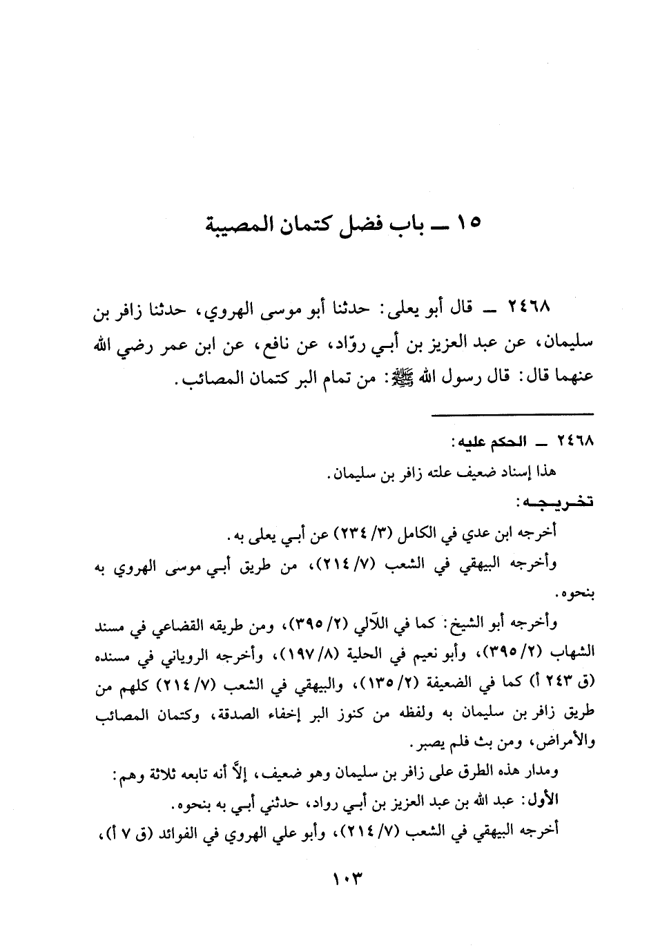 2468 - قَالَ أَبُو يَعْلَى: حَدَّثَنَا أَبُو مُوسَى الْهَرَوِيُّ، حَدَّثَنَا زَافِرُ بْنُ سُلَيْمَانَ، عَنْ عَبْدِ الْعَزِيزِ بْنِ أَبِي رَوَّادٍ، عَنْ نَافِعٍ، عَنِ ابْنِ عُمَرَ رَضِيَ الله عَنْهُمَا قَالَ: قَالَ رَسُولُ اللَّهِ صَلَّى اللَّهُ عَلَيْهِ وَسَلَّمَ: §مِنْ تَمَامِ الْبِرِّ كِتْمَانُ الْمَصَائِبِ.
